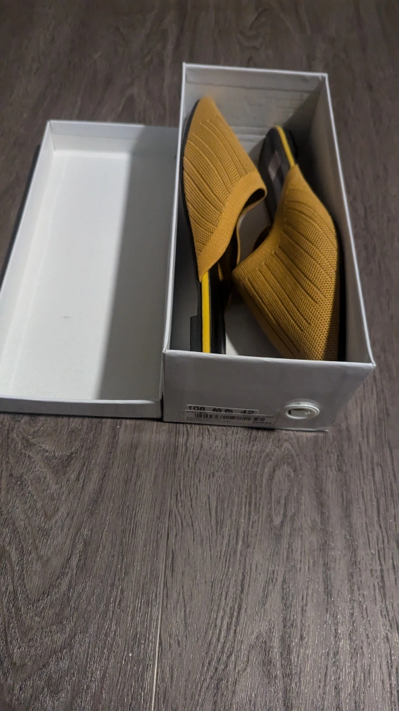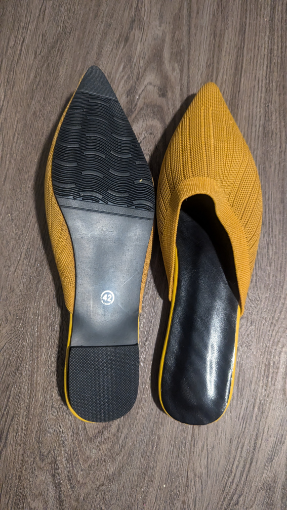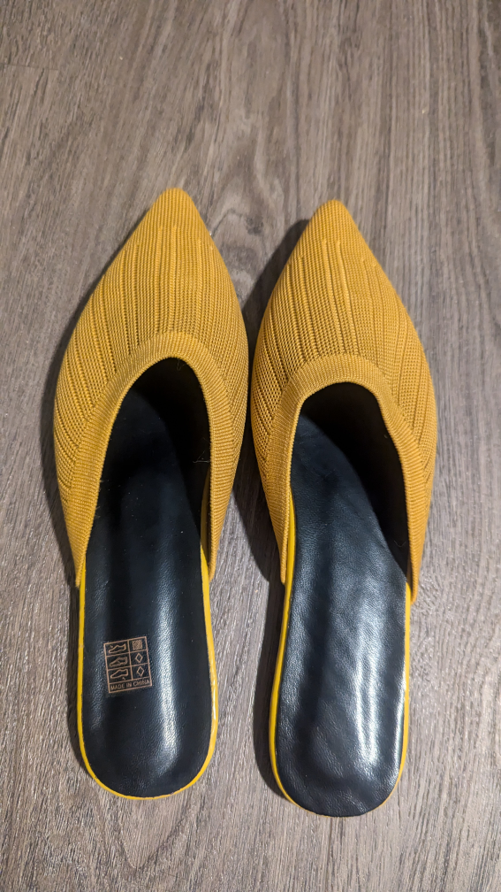These are a pair of yellow knitted mules. They have a pointed toe and a black sole. Original box, never worn.