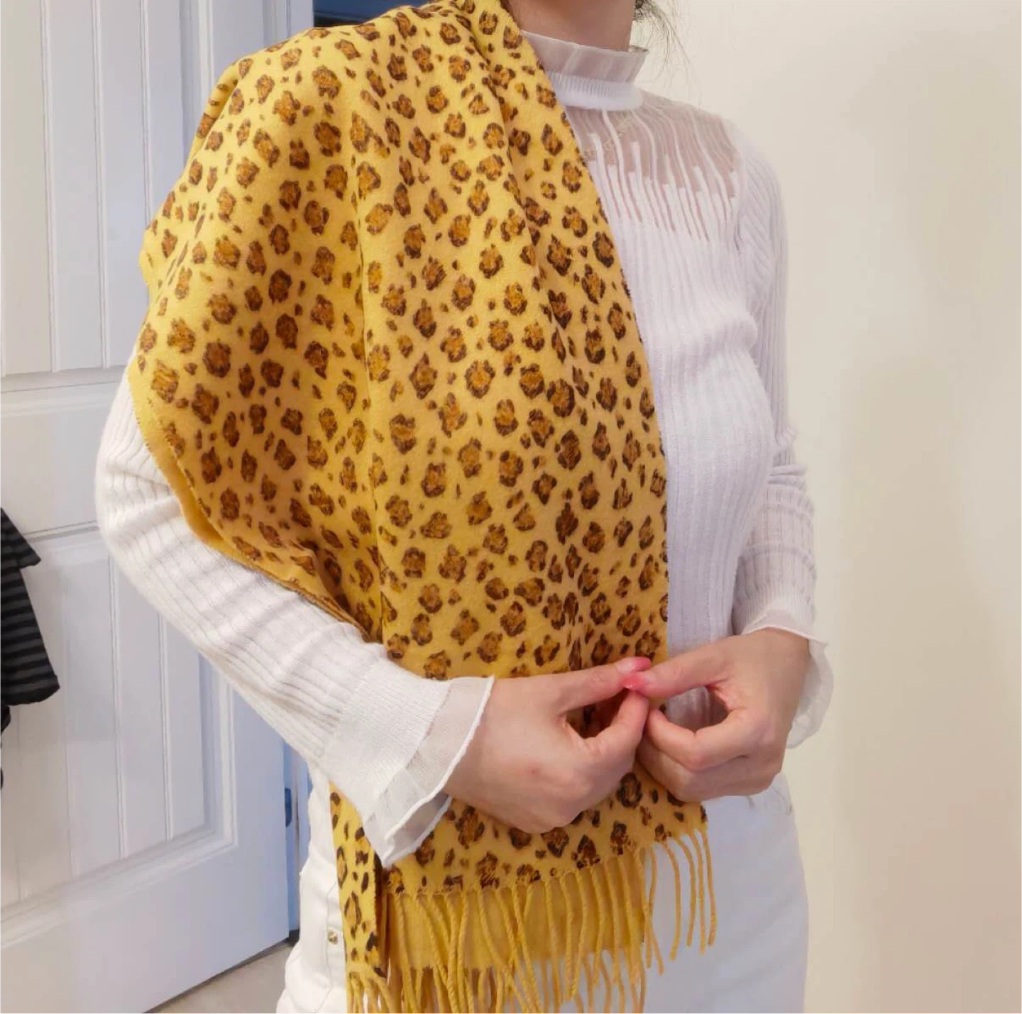 Selling a stylish yellow scarf with a fun leopard print! It's in great condition and perfect for adding a pop of colour to any outfit. The scarf has a fringed edge and is made of a soft material.