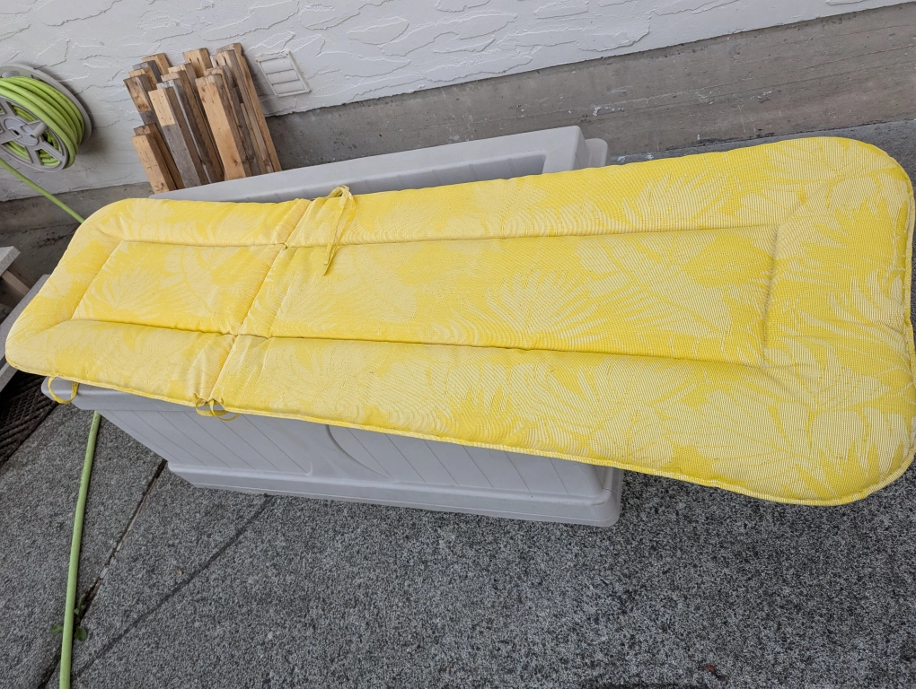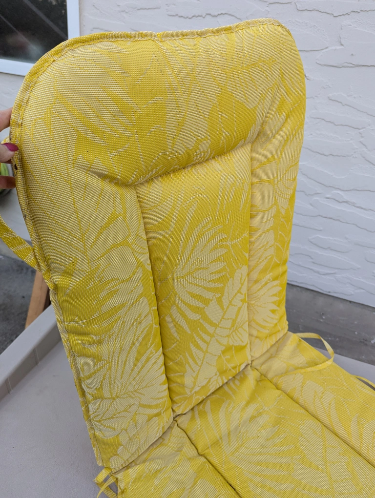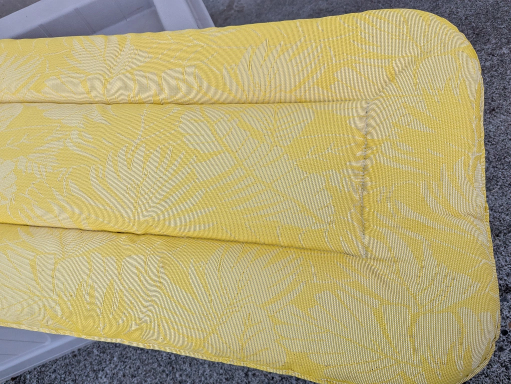 Here's a comfy yellow outdoor chaise lounge cushion! It's in great shape and ready to add some sunshine to your patio or deck. The cushion has a nice tropical leaf pattern. Perfect for relaxing in the sun!