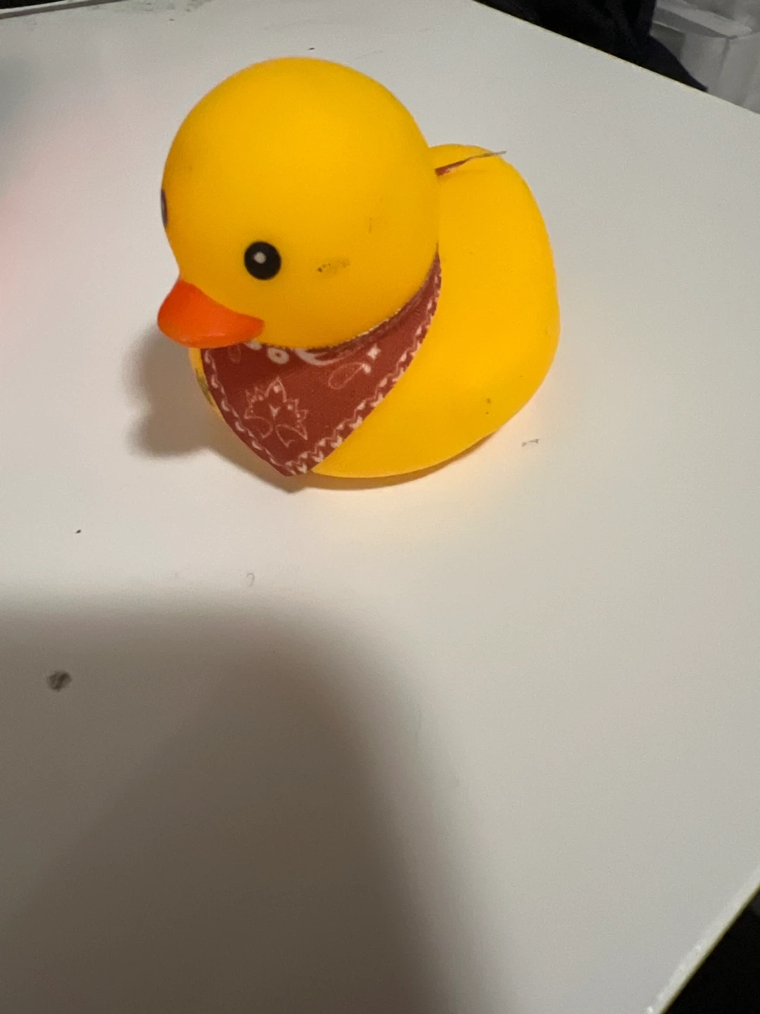 A cute yellow rubber duck! It has a red bandana around its neck. Perfect for bath time fun!