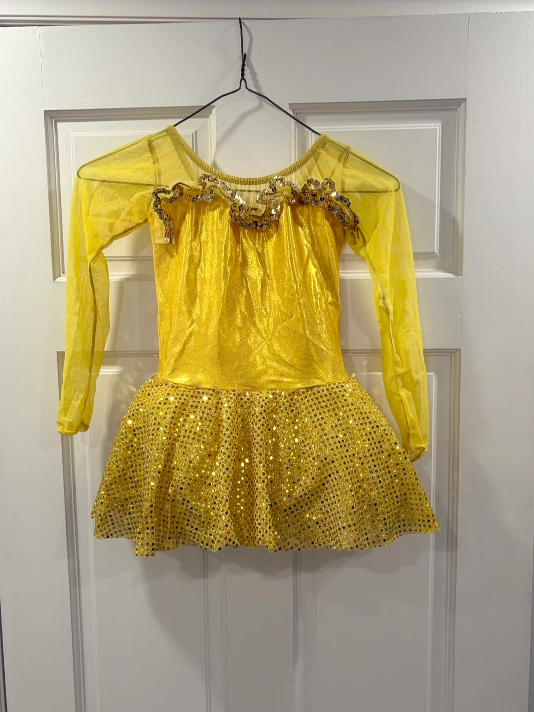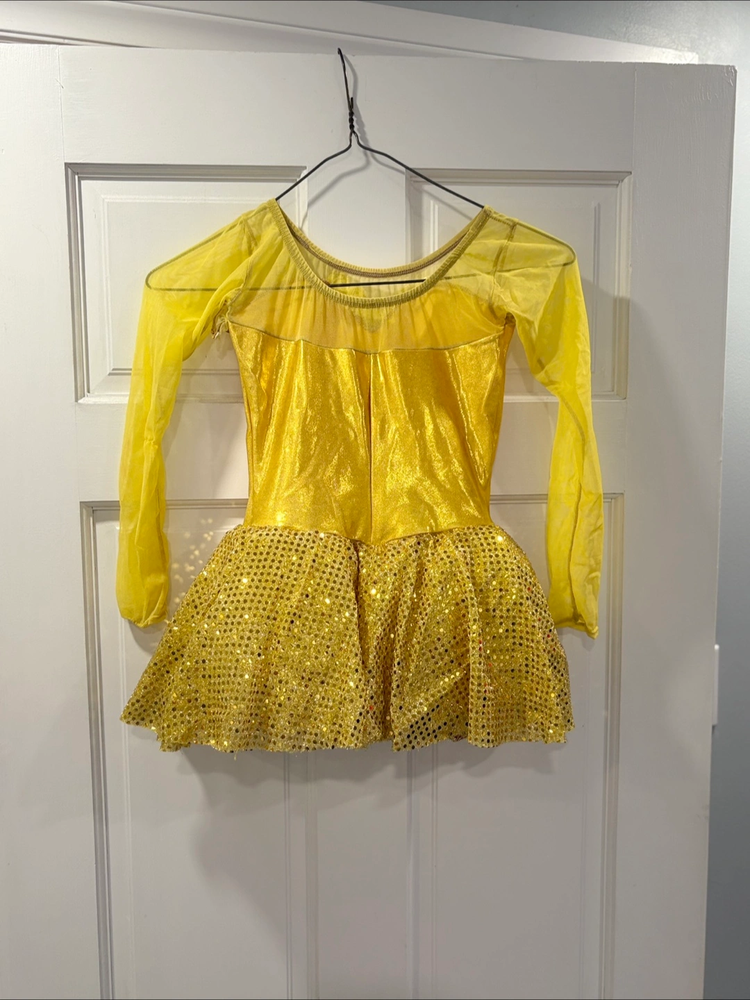 Selling a bright yellow dance costume with sequins. It features long sleeves and a full, sequined skirt. Perfect for performances or practice! Delivery is an extra $5
