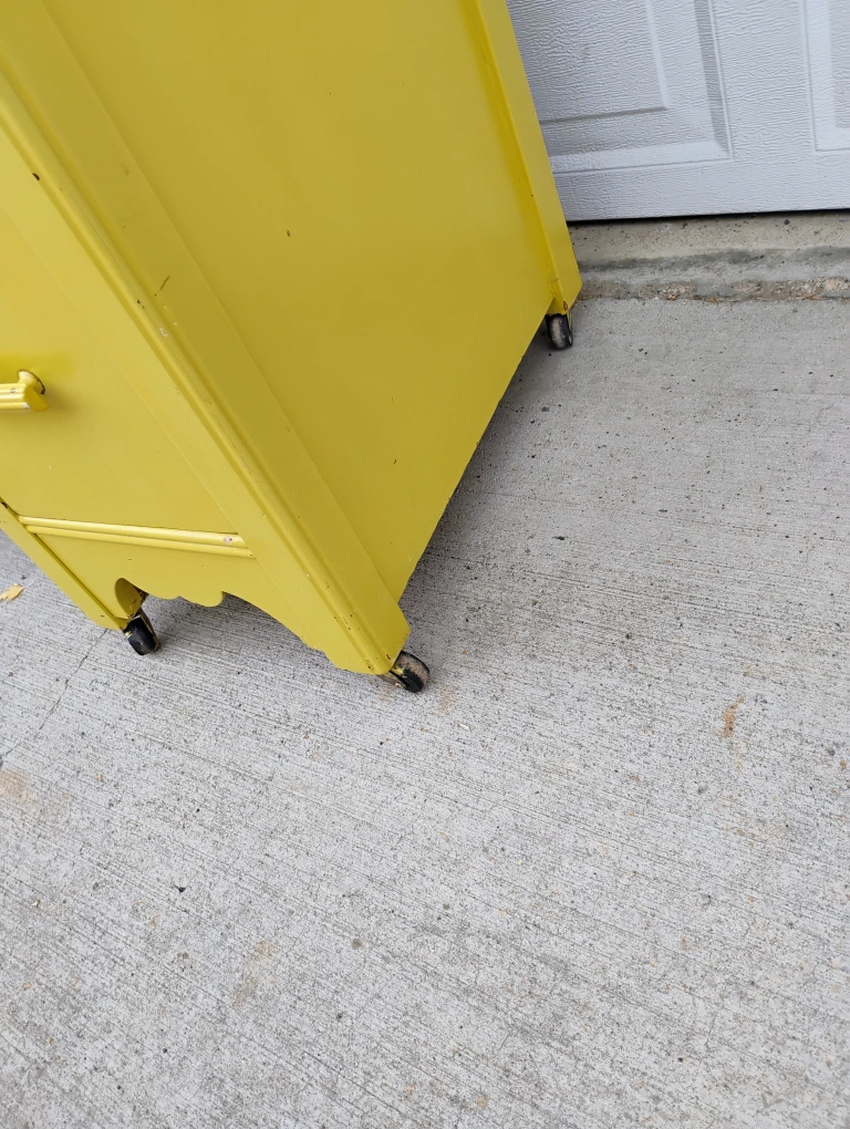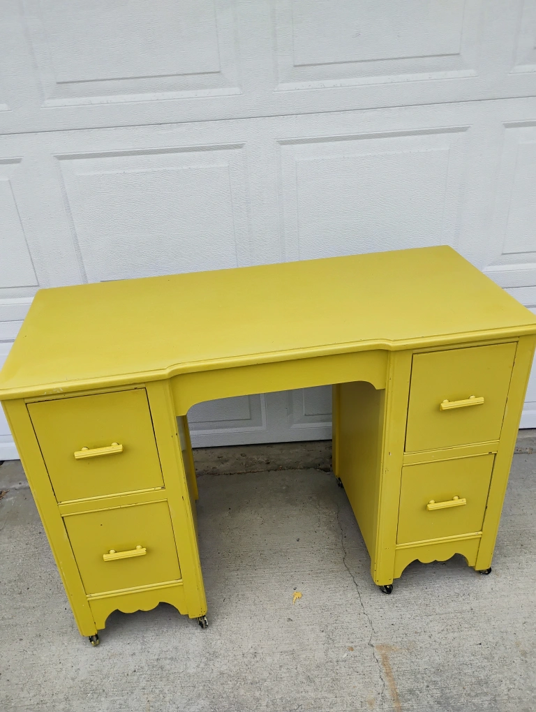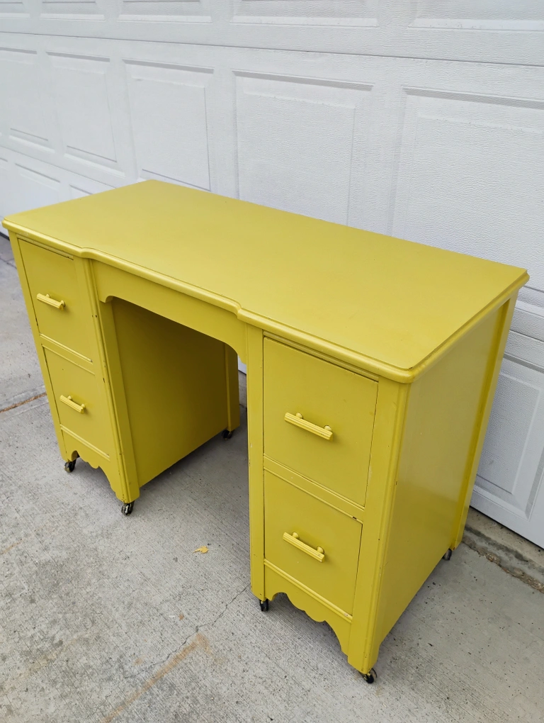 Here's a vintage desk painted in a bright yellow colour. It features multiple drawers on either side, providing lots of storage space. The desk also has wheels for easy movement. It's a unique and functional piece for any home office or workspace! 107(length)*47(width) *75(height) centimeters 43" * 19" * 29.5" inches