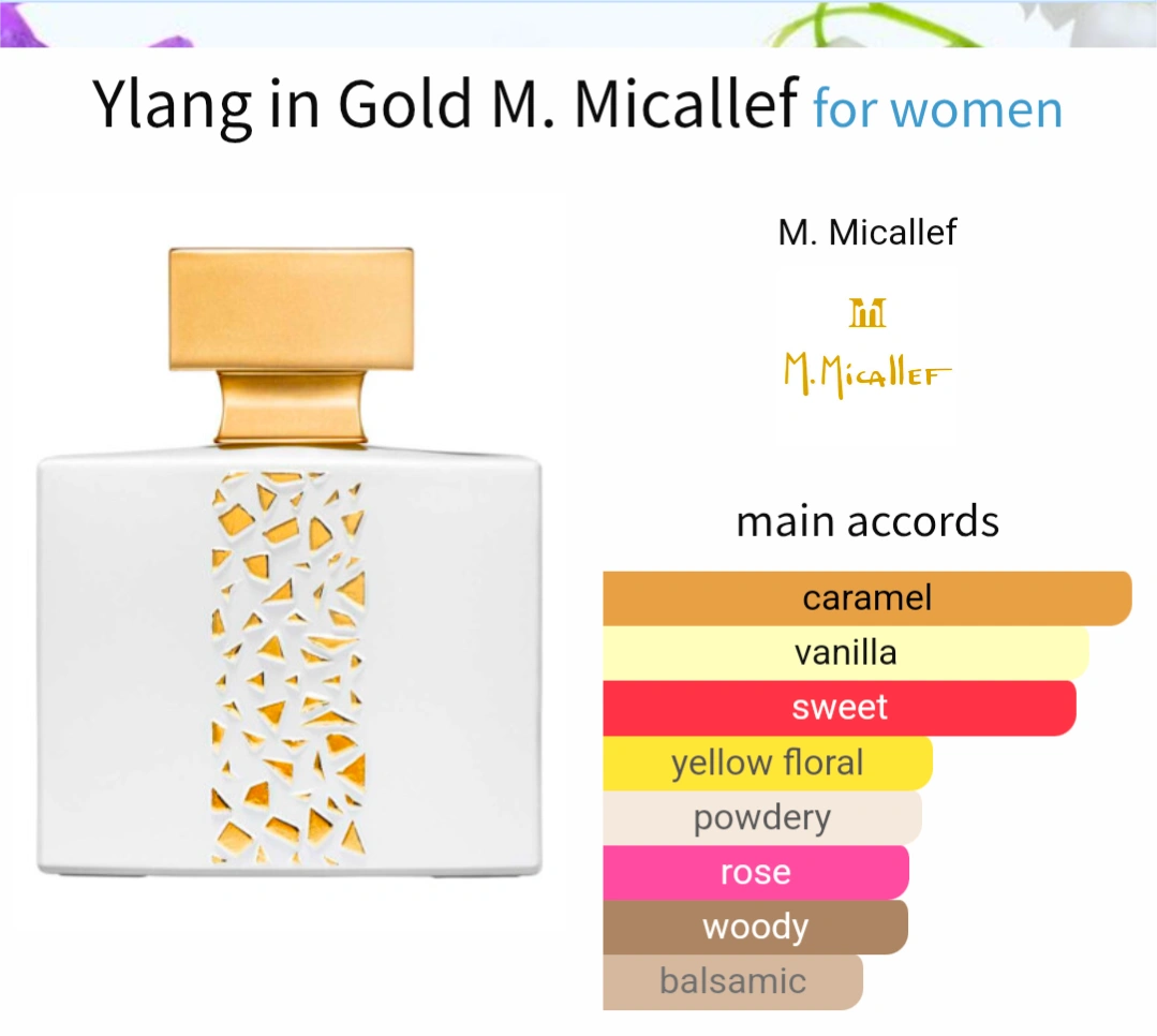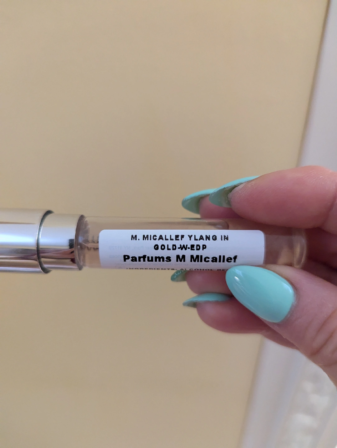From the niche house M. Micallef Ylang in Gold Eau de Parfum sample from FragranceNet. It's a lovely fragrance with main accords of caramel, vanilla, and sweet notes.