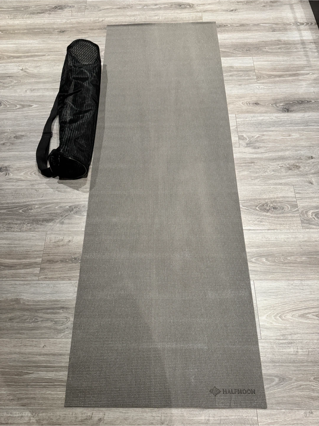 The Halfmoon Essential Studio Yoga Mat Color: Charcoal Specs: 4mm (1/6 inch) thick 24" x 72" (61 cm x 183 cm) 2.4 lbs (1.1 kg) 100% non-toxic PVC