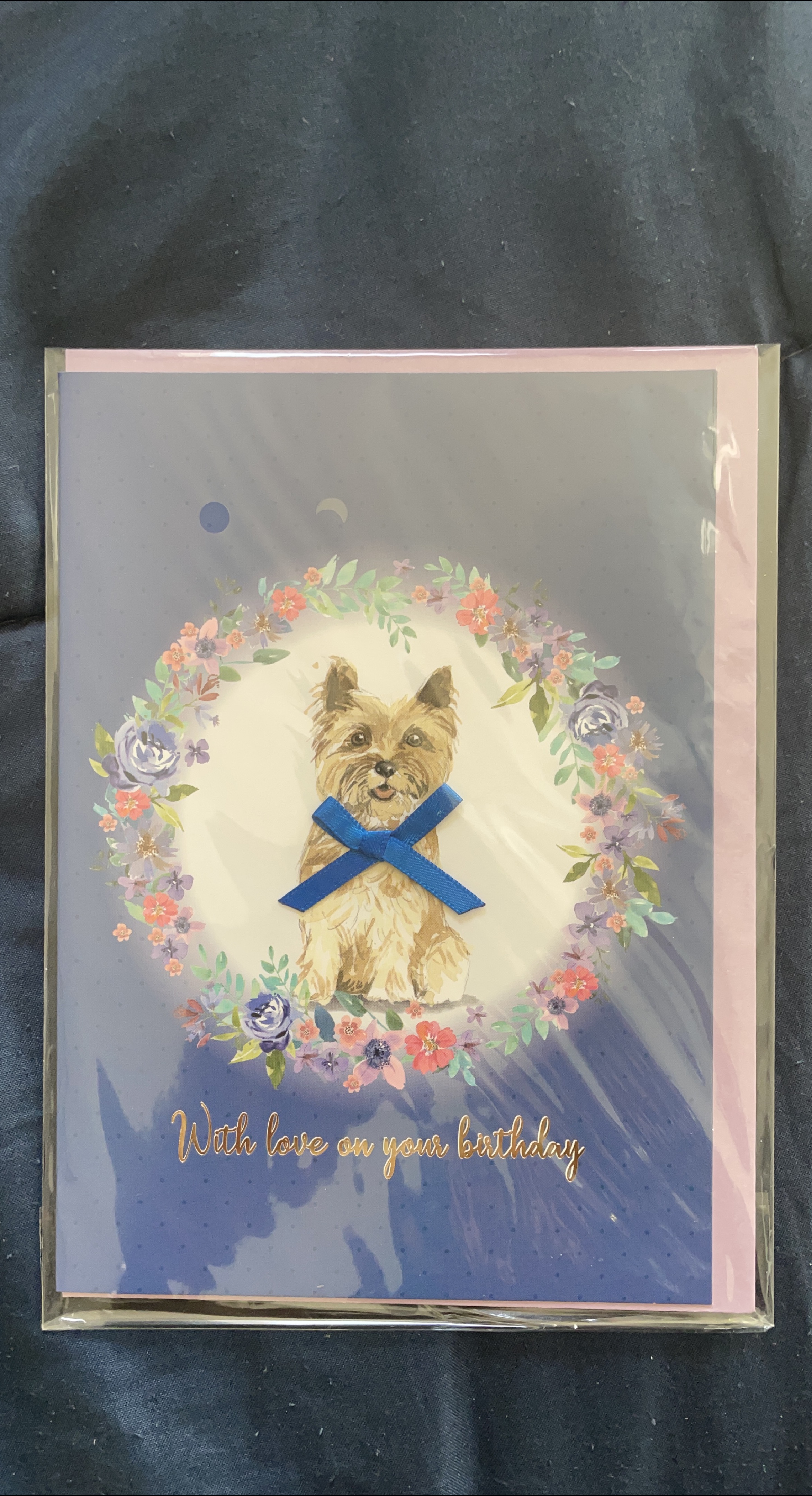 New birthday card featuring an adorable Yorkie with a blue ribbon, surrounded by a floral wreath! The card has the text "With love on your birthday" in gold lettering