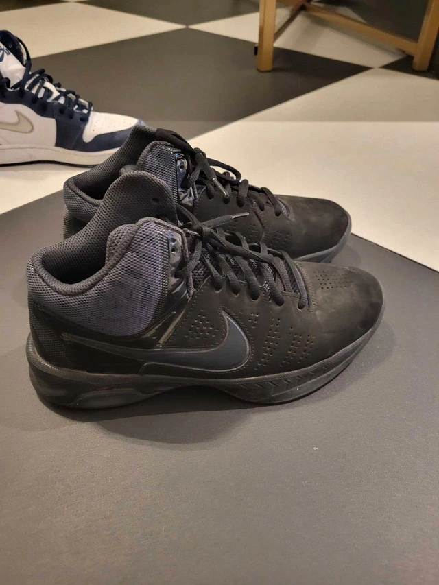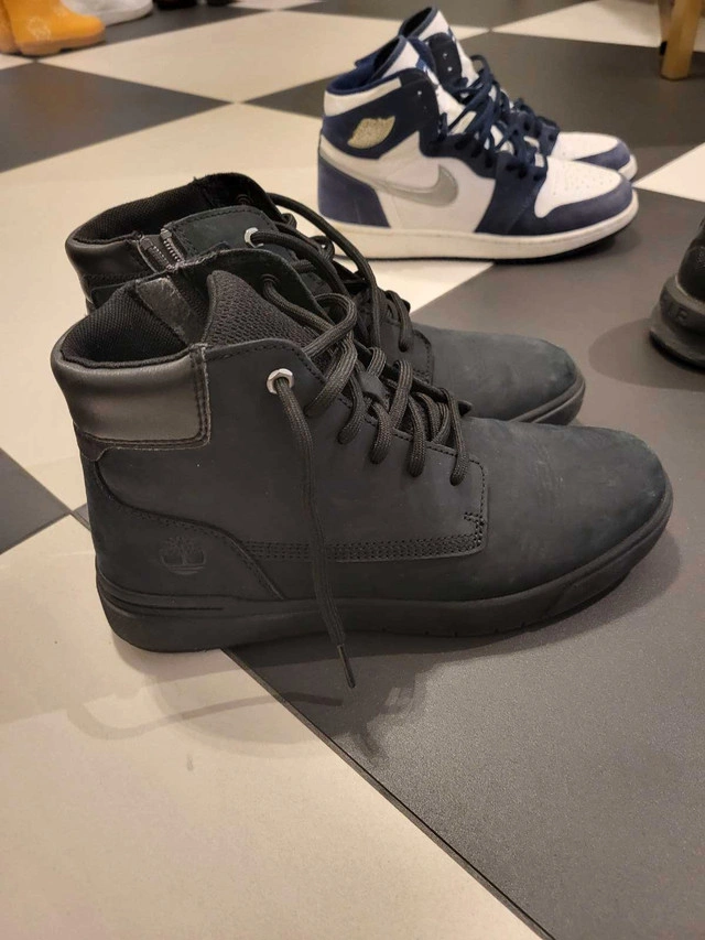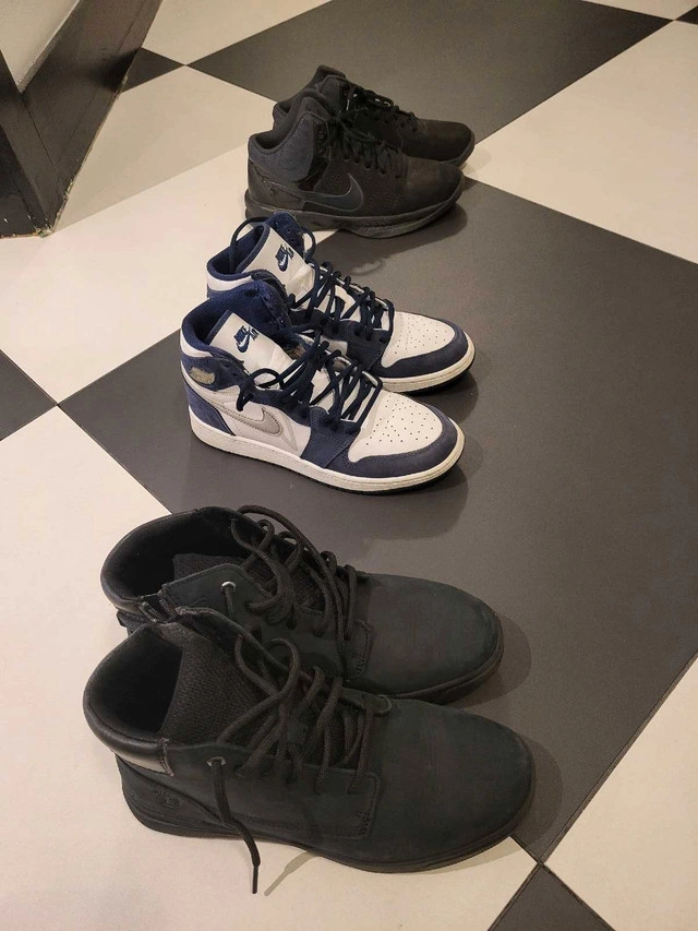 I'm offering a collection of youth shoes including Nike high tops in a stylish blue and white colourway, sleek black Nike basketball shoes, and durable black Timberland boots, perfect for active kids. These are gently, but in great condition! * **Nike High Tops:** Blue and white colorway. Size 6Y. * **Nike Basketball Shoes:** Sleek black design. Size 6Y * **Timberland Boots:** Durable black boots. Size 5.5Y Get all 3 for 1 low price and before they are gone! If the ad is up, they're available! Don't miss out!