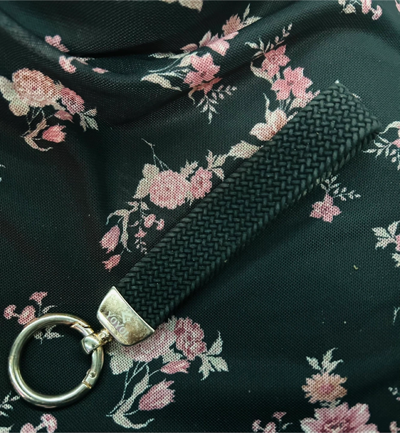 Selling a Yoyoi keychain. It's black with a woven texture and has a silver-tone ring and clasp. Perfect for adding a little something extra to your keys or bag