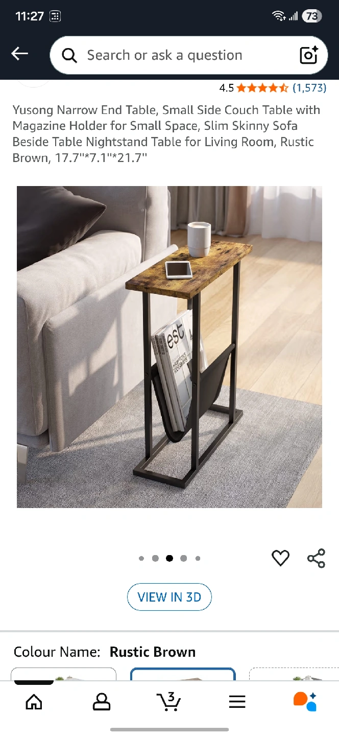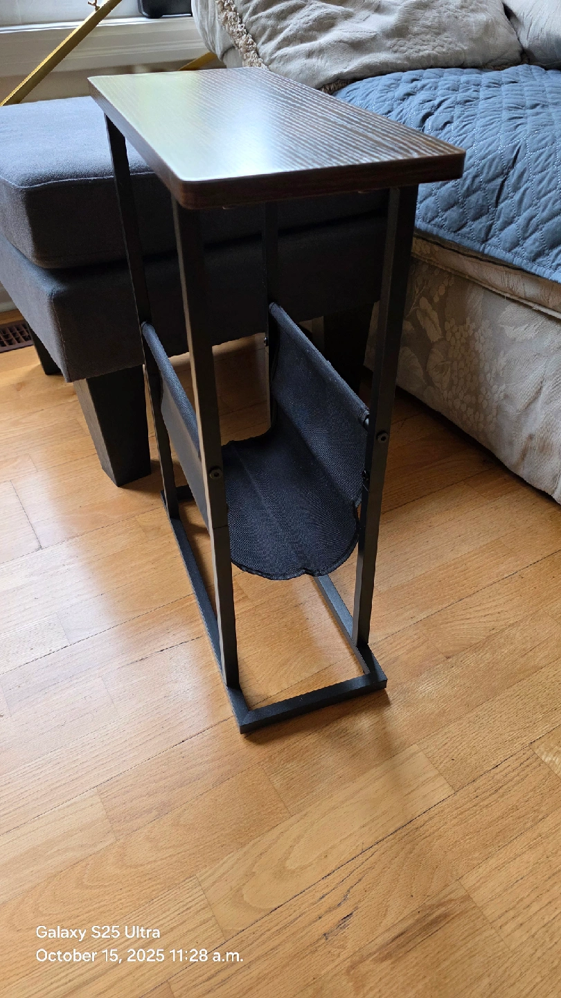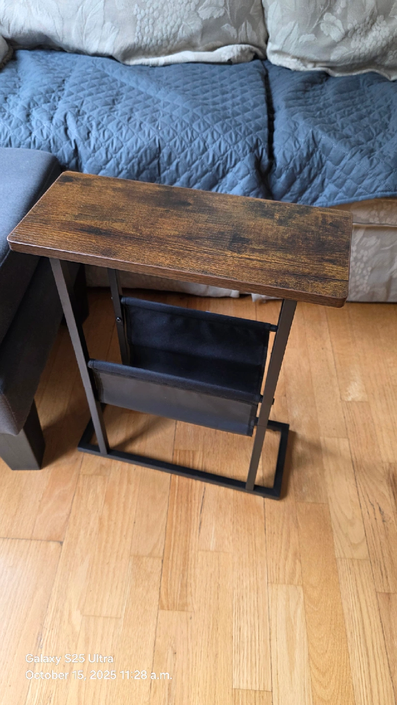 Selling a Yusong narrow end table in rustic brown. It's a small side couch table with a magazine holder. It's perfect as a slim skinny bedside table or for the living room. Size: 16.7"W *7.1"*21.7"