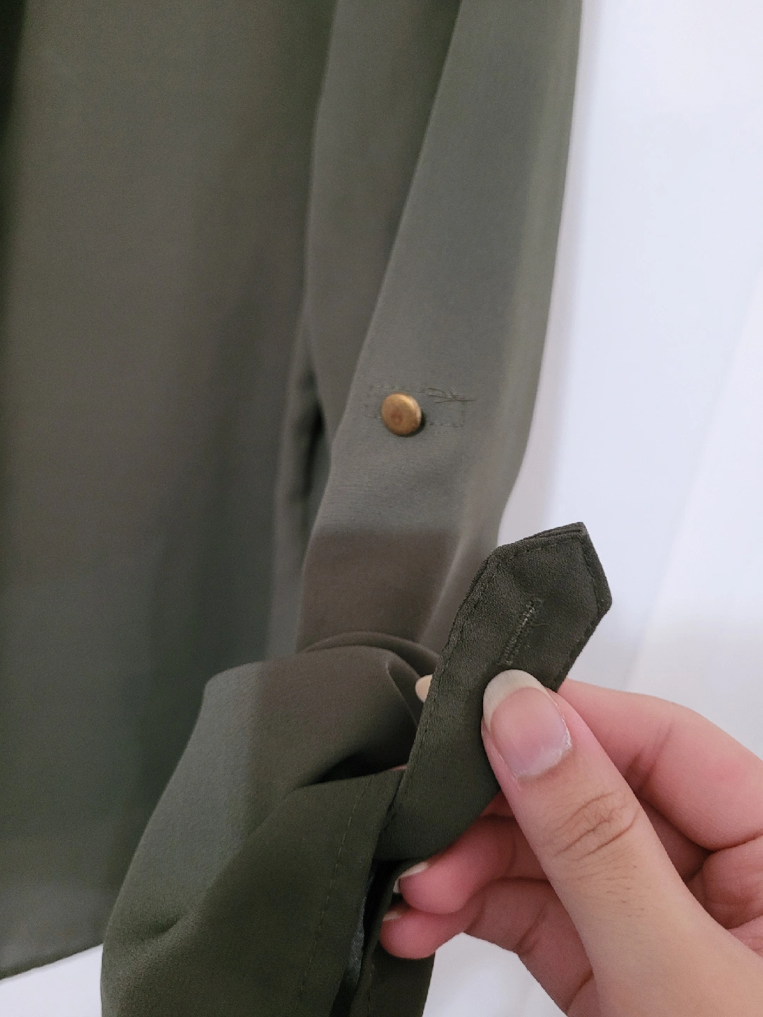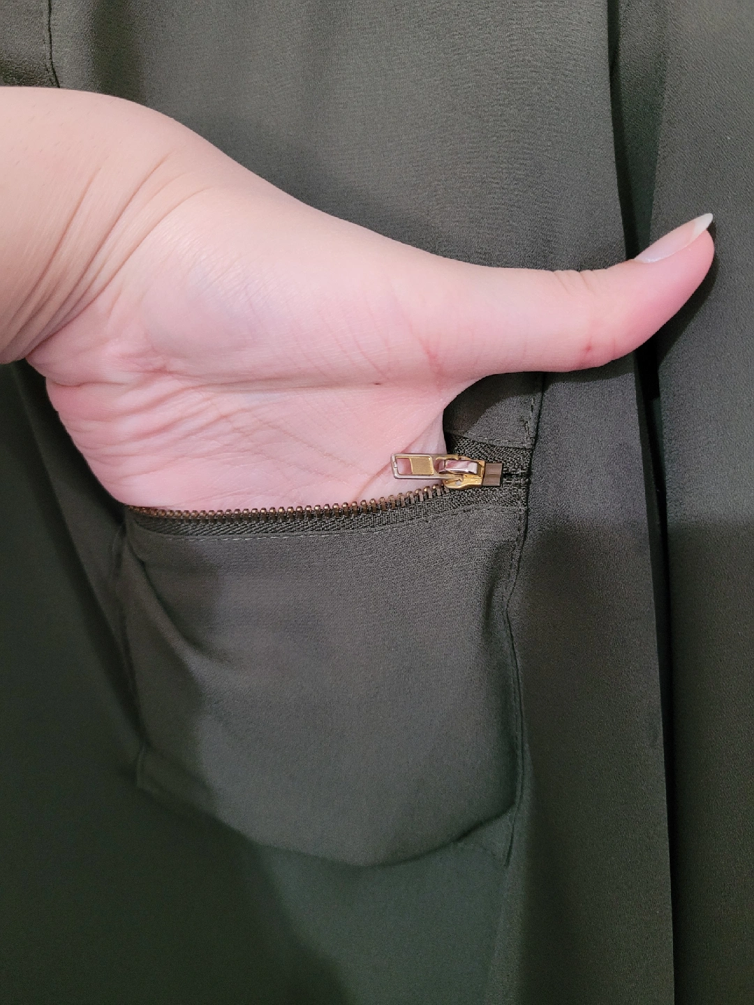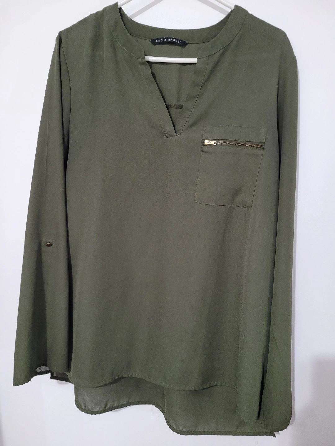 Here's a Zac & Rachel blouse in a lovely olive green colour! It features a stylish V-neck and a cute zippered pocket on the front. Perfect for a casual day out or dressing up for work!