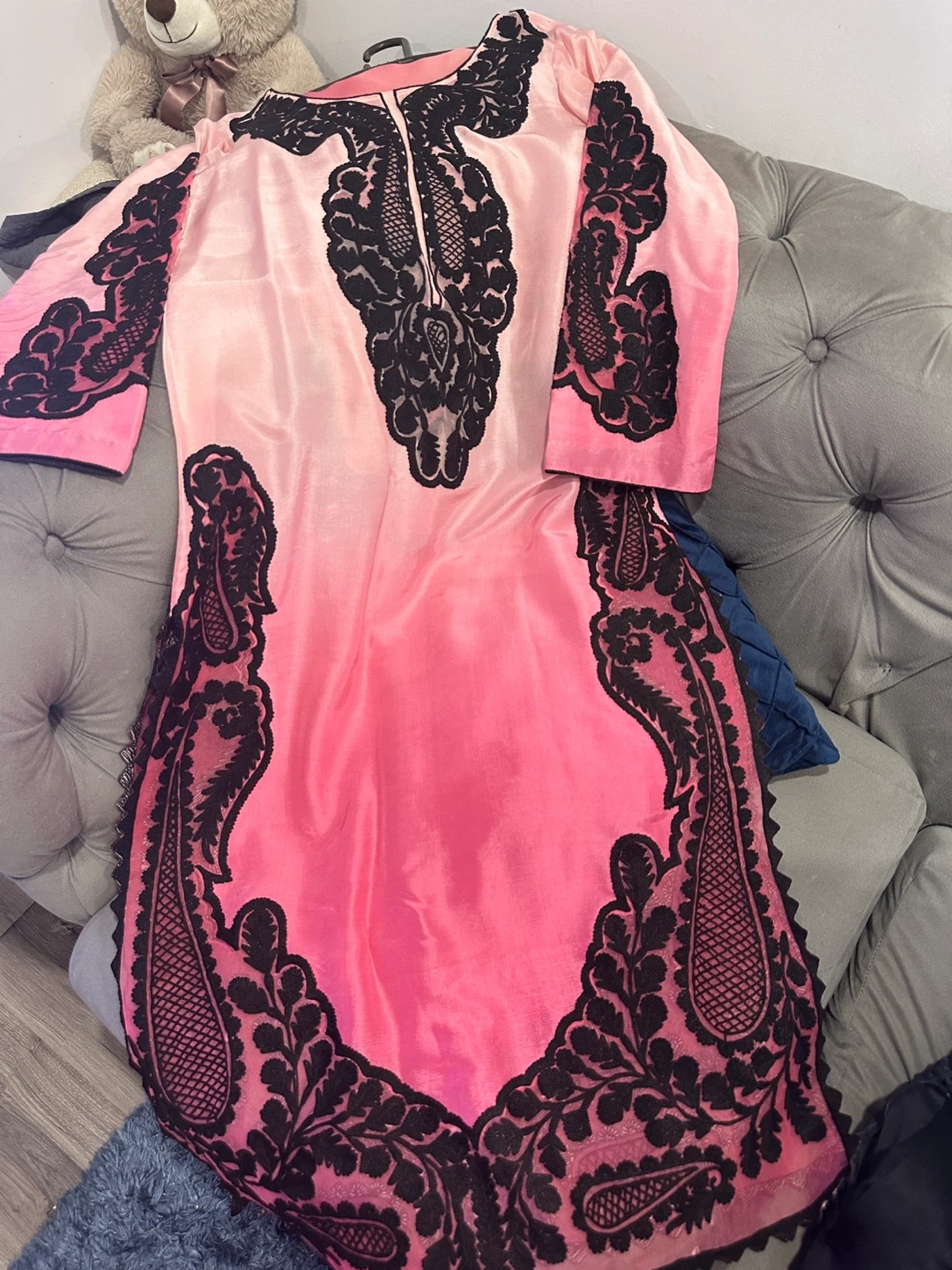 Beautiful pink dress with black embroidery detailing. It's new, ready for a new home! The fabric feels soft and comfortable, perfect for any occasion