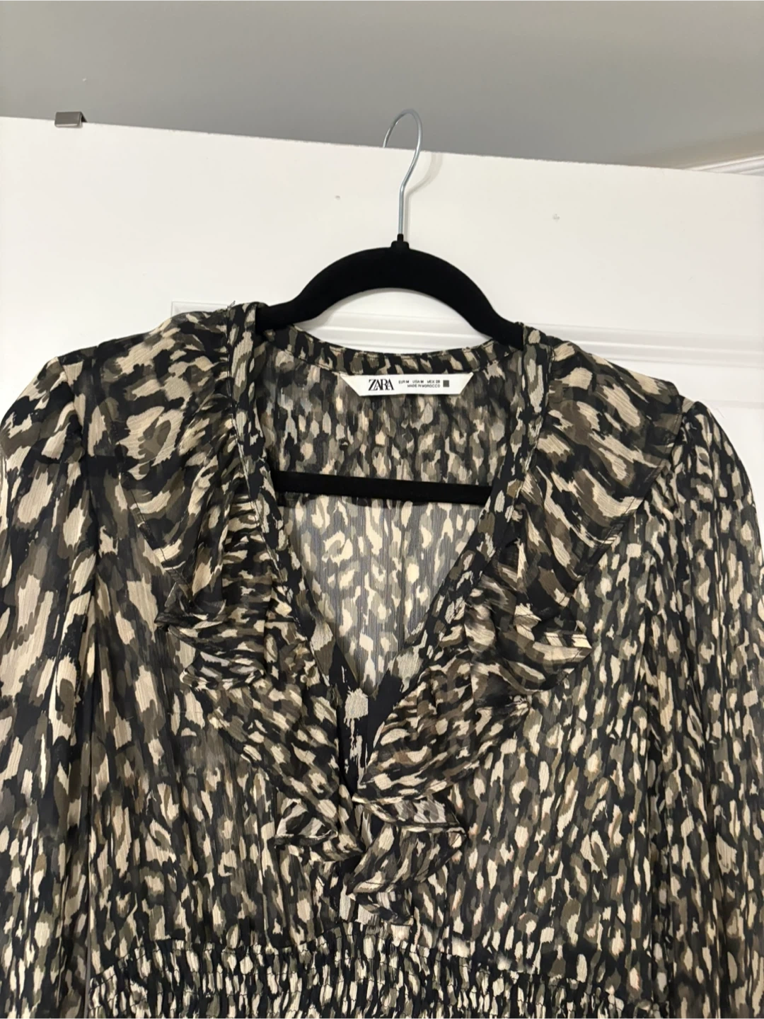Selling a Zara animal print dress in size medium! It's a stylish and flowy dress perfect for any occasion. The dress features a ruffled V-neck and an elastic waistband for a comfortable fit. It's in like new condition and ready for a new home!