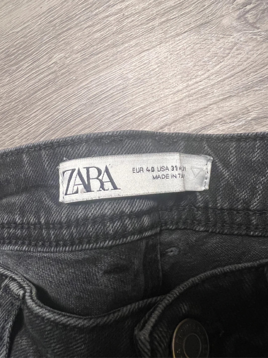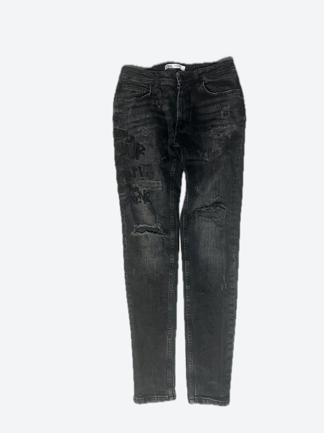 Selling a pair of Zara black distressed jeans in size 31. They have a cool, edgy look with the distressed details and unique design. Perfect for adding some character to your wardrobe!