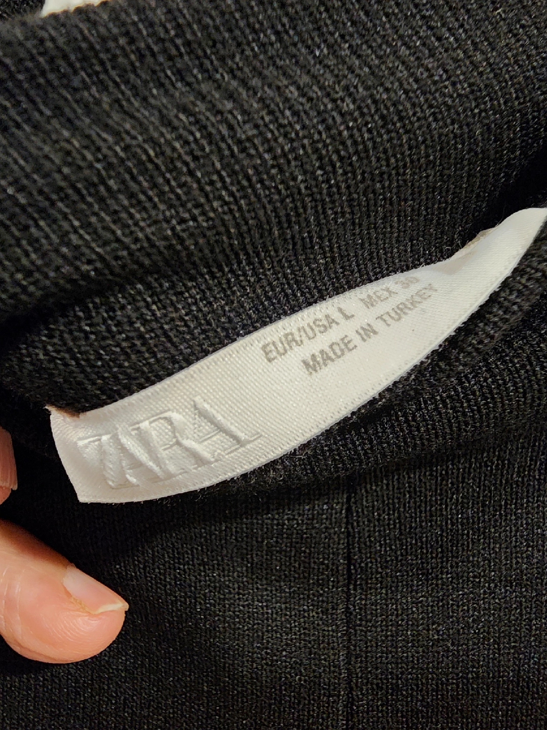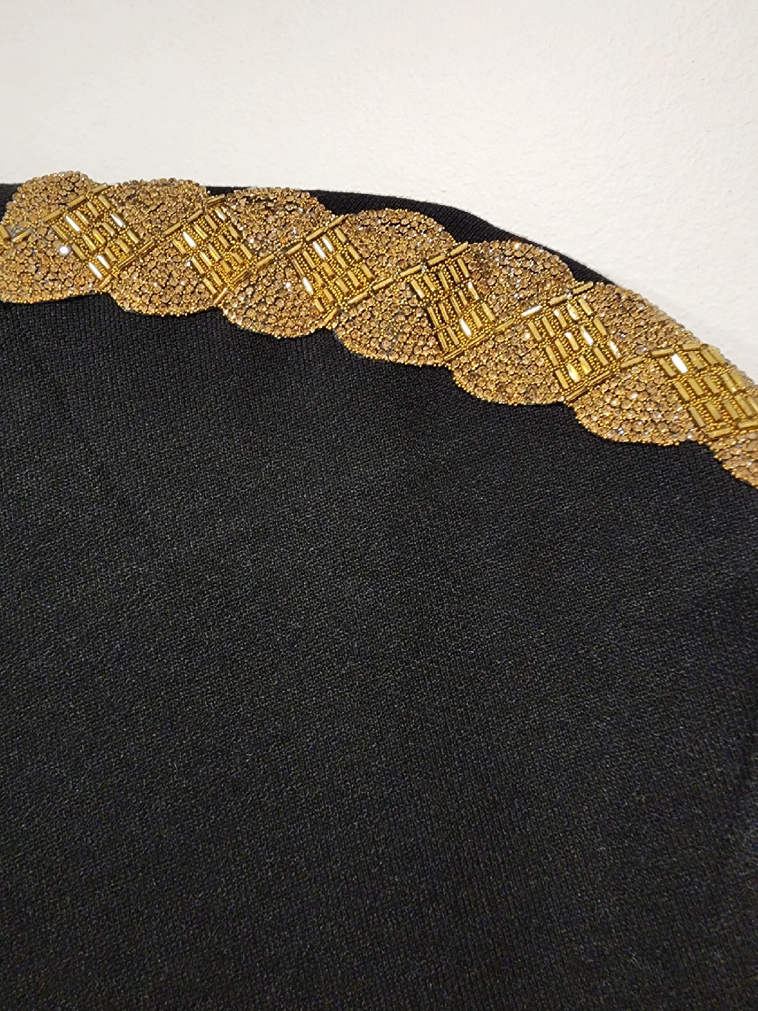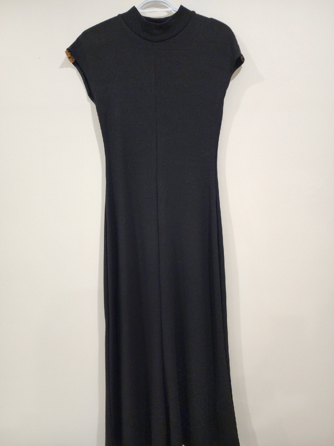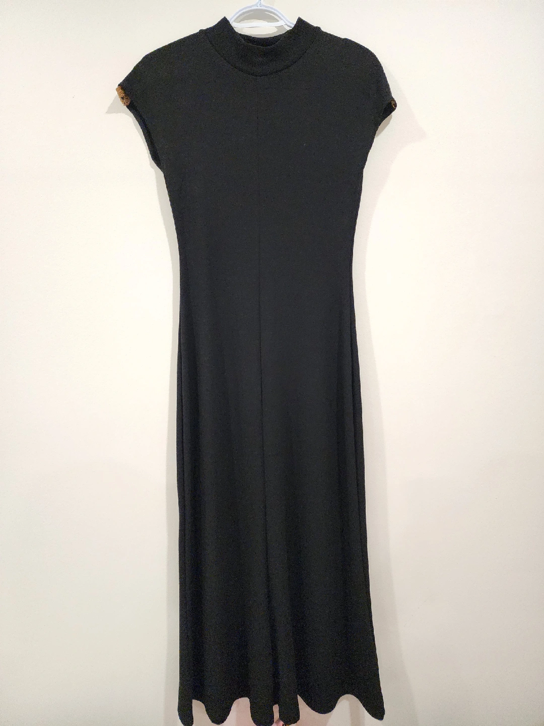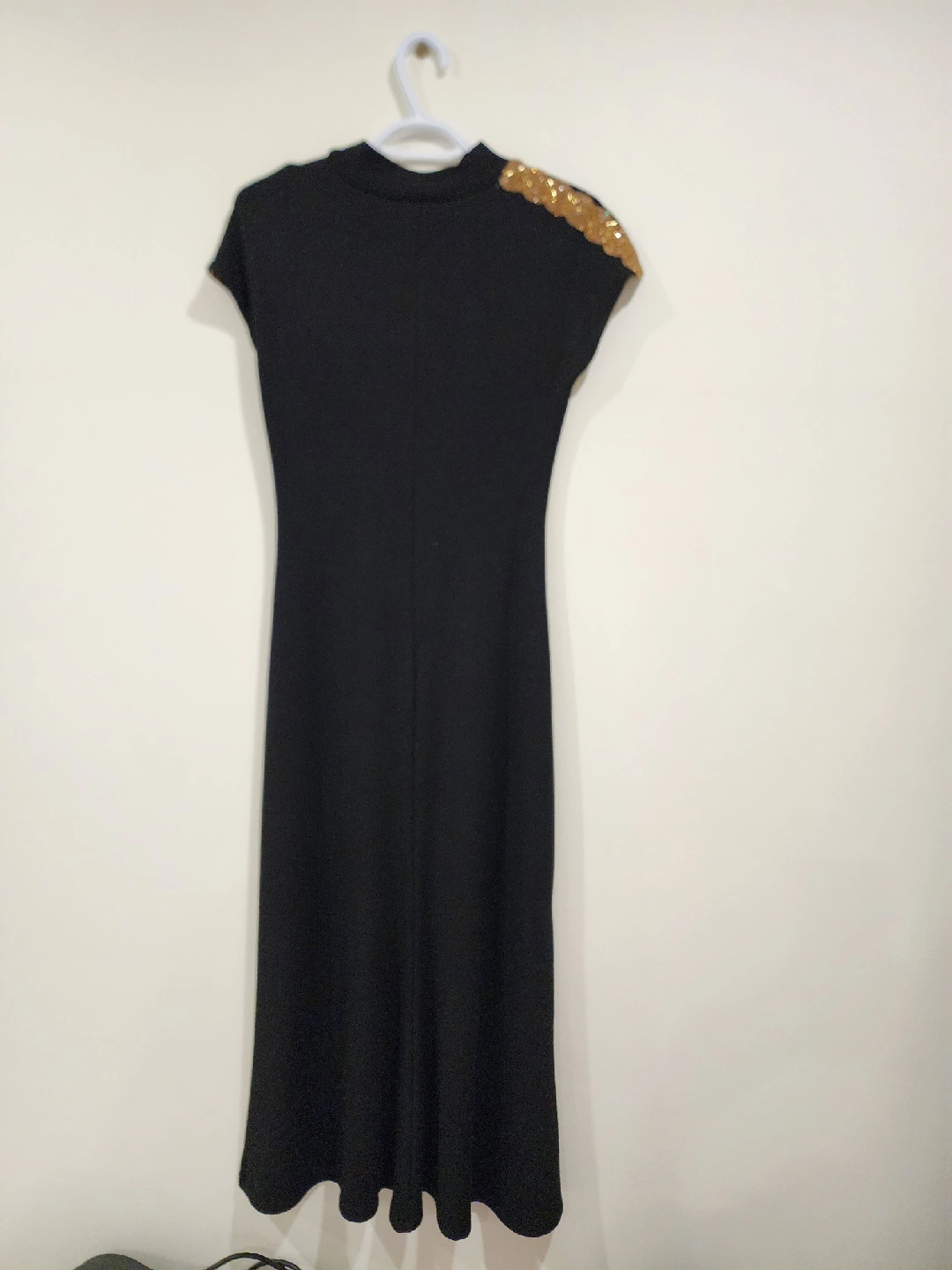 Selling a Zara black dress in size L. It features a high neckline and short sleeves. The dress has a slim fit and a gold beaded accent on the shoulder. Perfect for a night out!