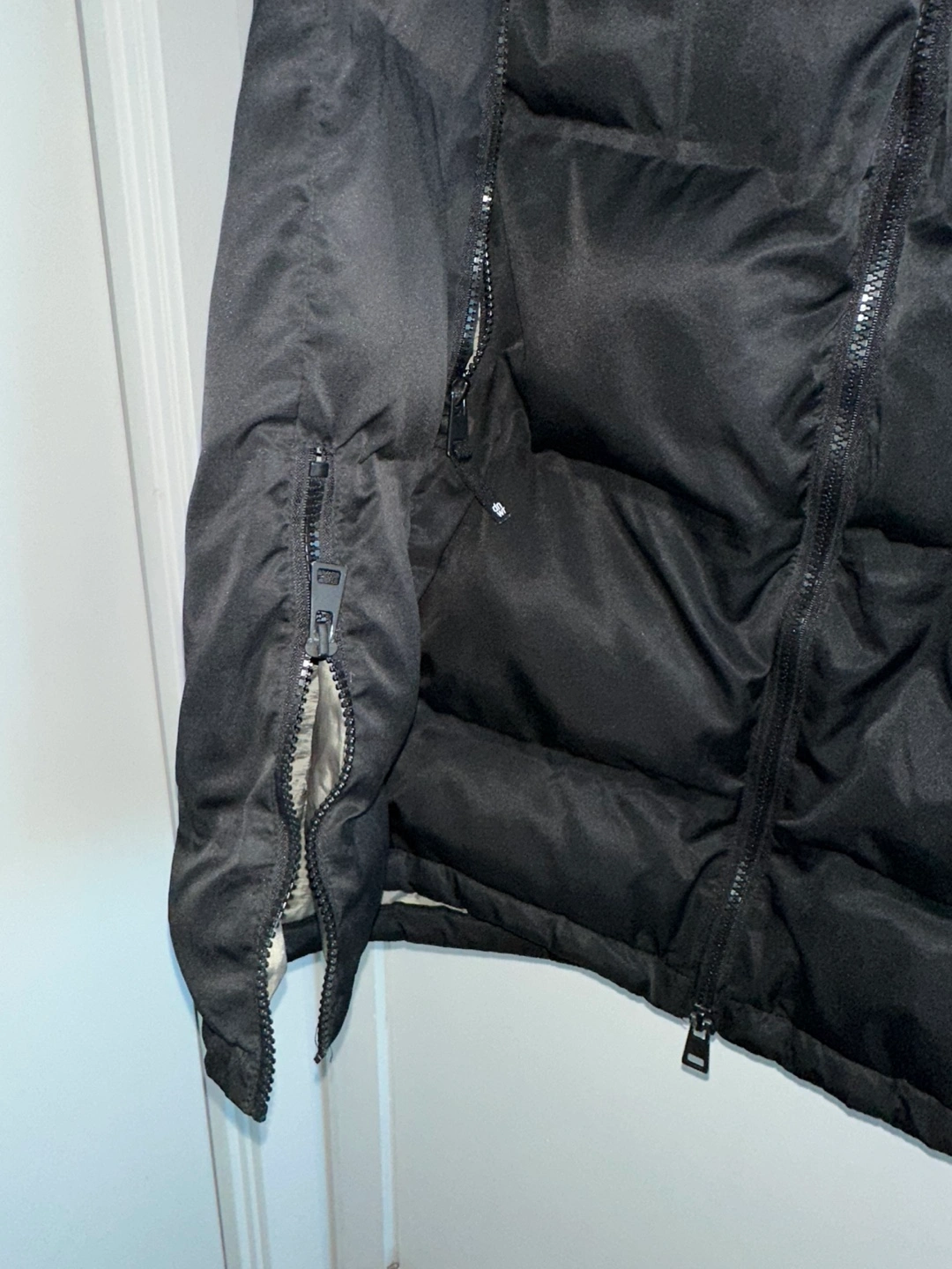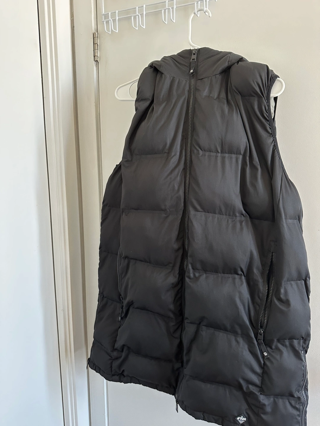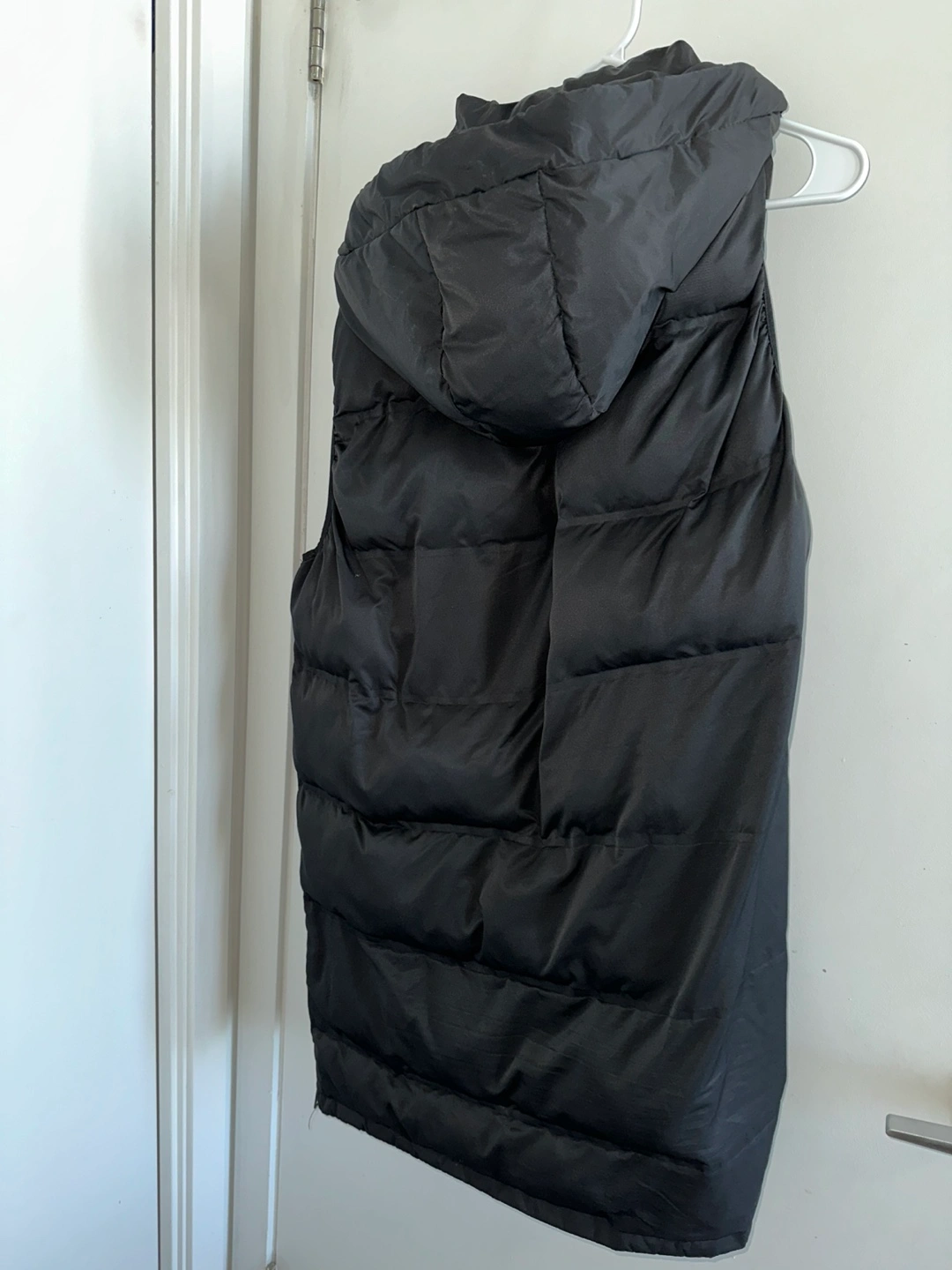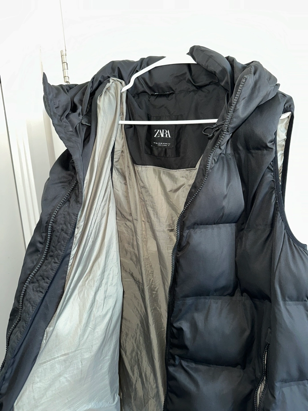Selling a Zara black puffer vest in size XL. It's in great condition and perfect for layering during the cooler months! The vest has a hood and zipper closure.