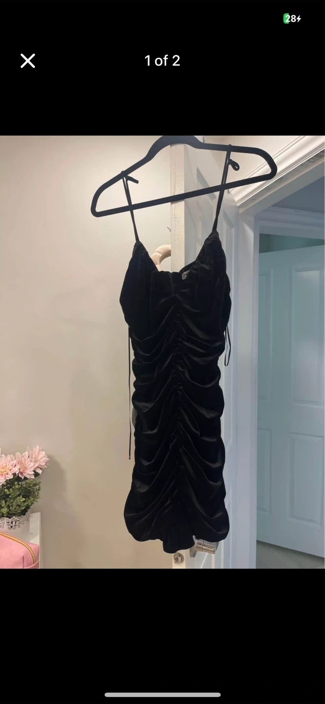 Selling a cute Zara black velvet mini dress! It's in great condition and perfect for a night out or special occasion. The dress features a flattering ruched design and adjustable straps.
