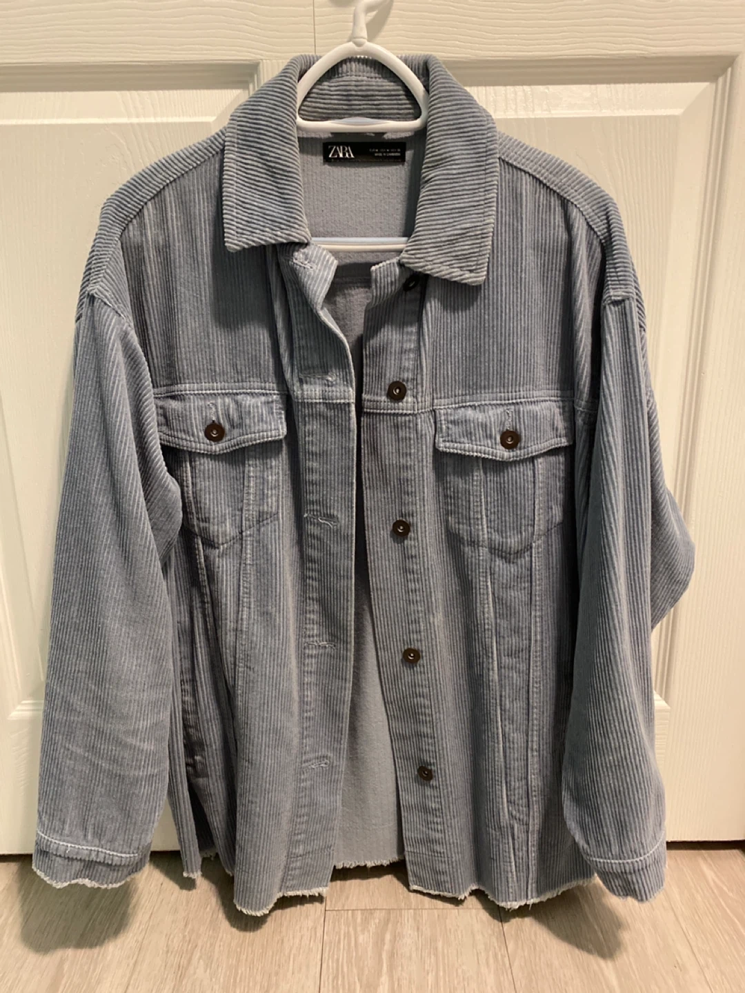 Selling a Zara corduroy overshirt in size medium. It's a light blue colour and made of corduroy material. It features a button-up front and two chest pockets. Perfect for layering!