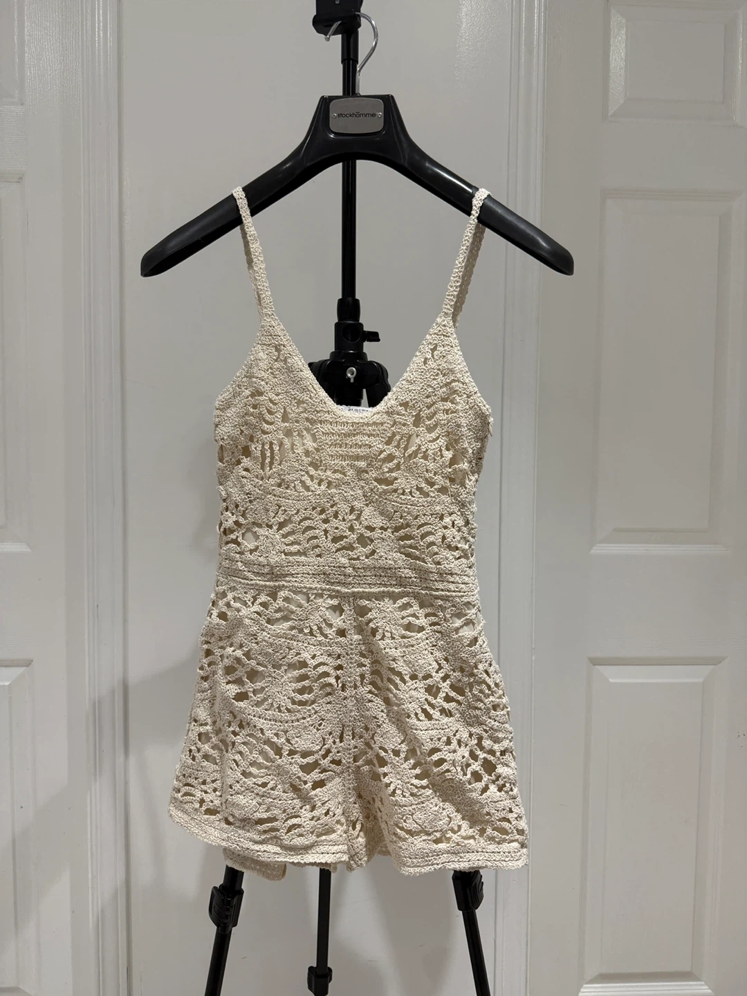Selling a cute Zara crochet romper in size small. It's in great condition and perfect for summer! The romper is a cream/off-white colour and has a zipper on the side.