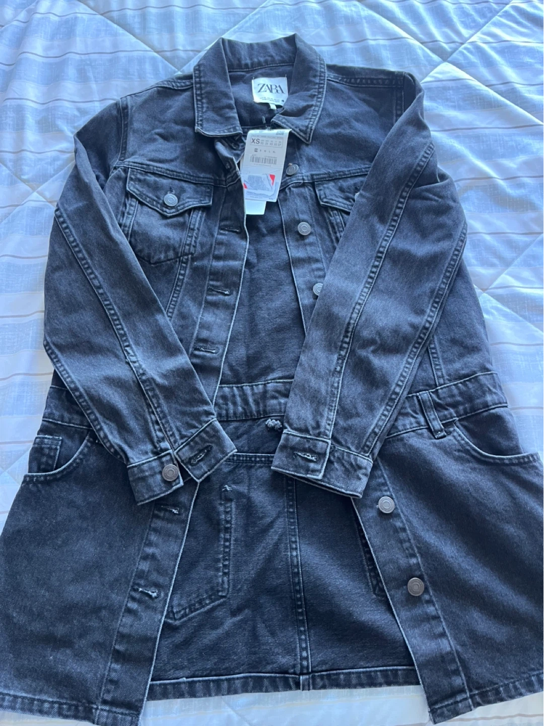 Selling a ZARA denim dress jacket in size XS. It's in great condition and perfect for layering or wearing as a dress! The dark wash denim gives it a stylish and versatile look. Feel free to message me with any questions!