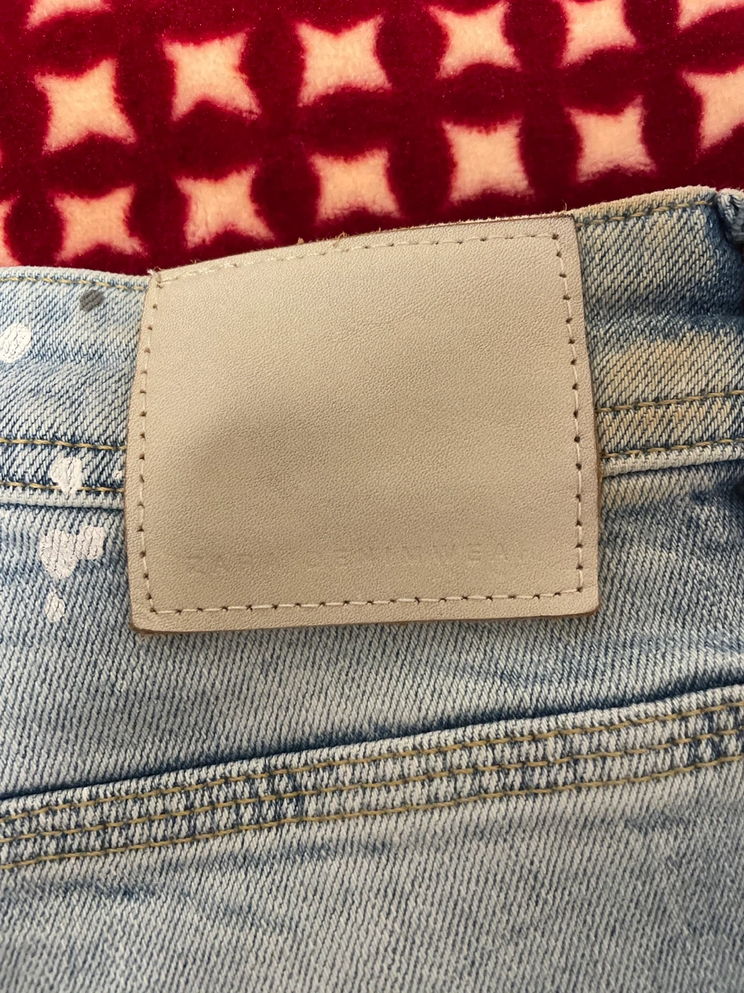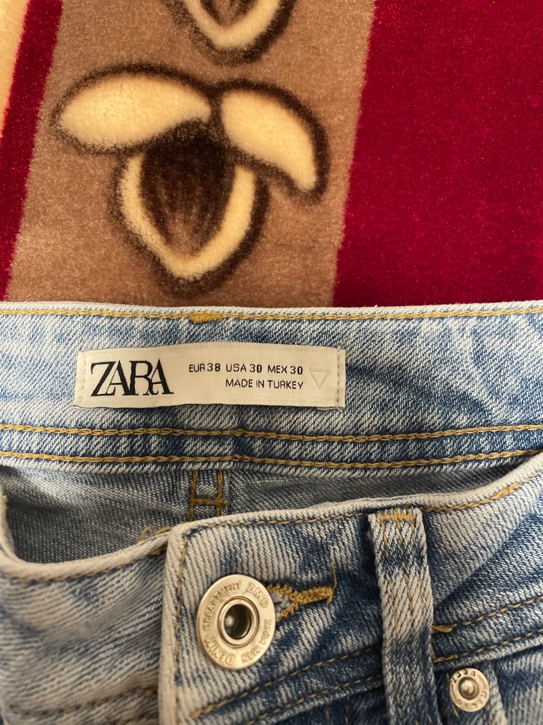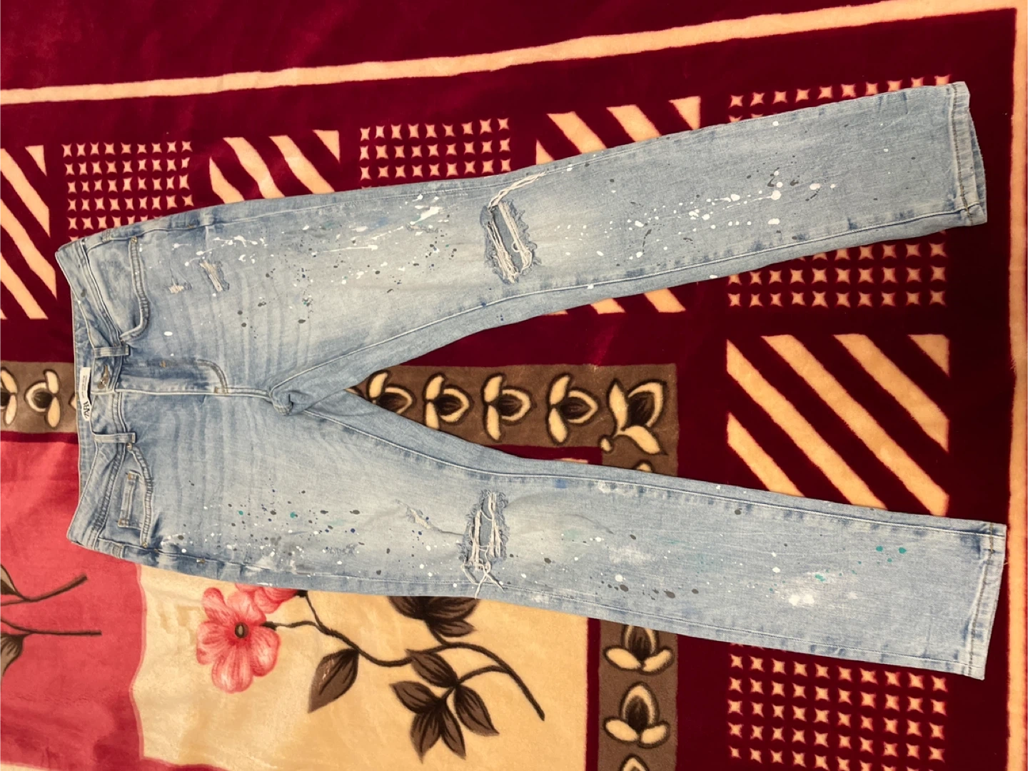 Selling a pair of Zara distressed jeans in size 30! These jeans feature a light wash denim with paint splatter details and distressed knees. They are in great condition and ready for a new home!