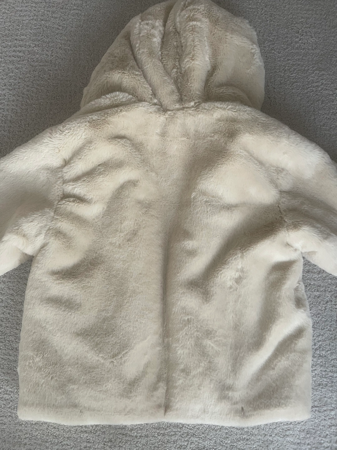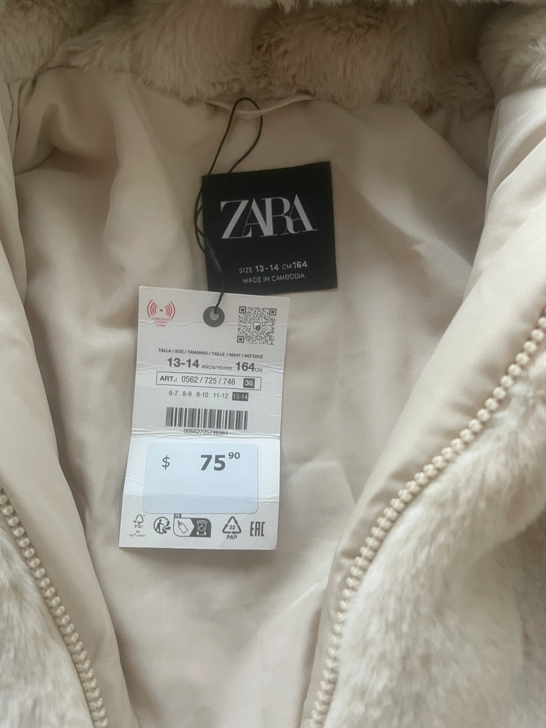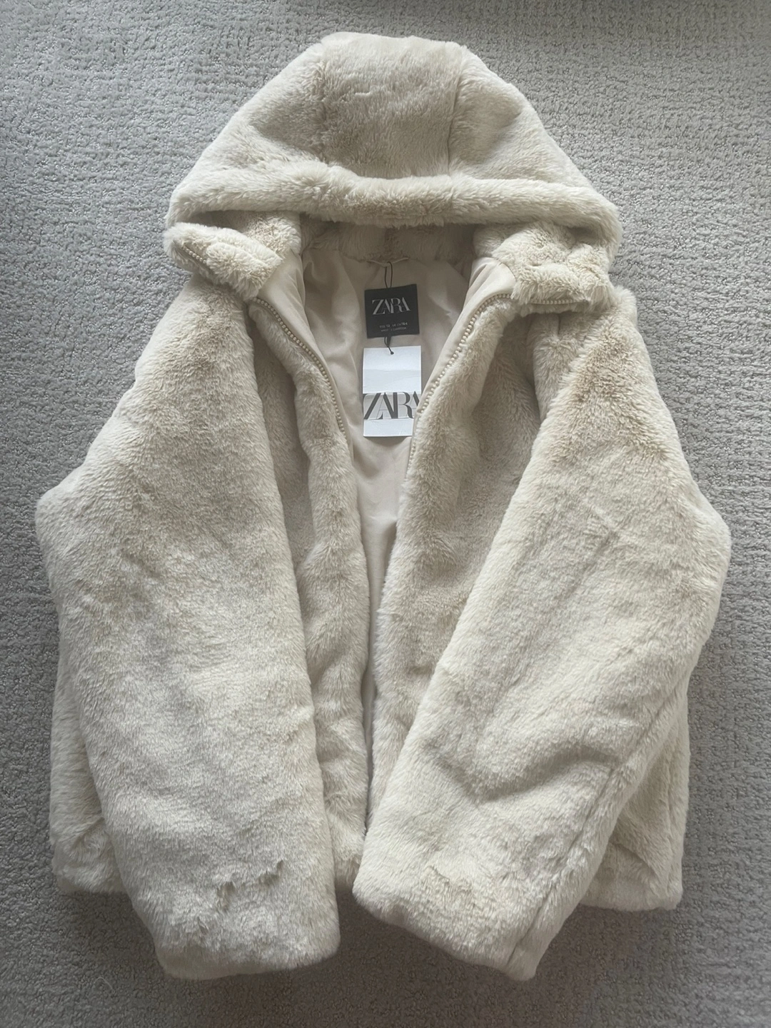 Cozy Zara faux fur jacket in a neutral tone. It's a size 13-14 (164 cm). Originally bought for $75.90. Perfect for keeping warm and stylish!