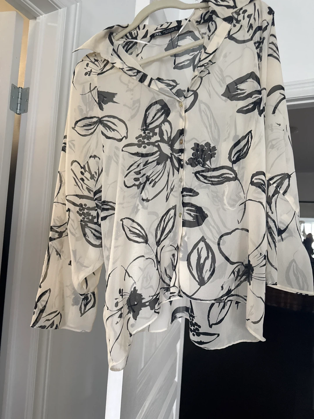 Selling a Zara blouse with a lovely floral print! It's a size medium and made in Morocco. The blouse features a button-up front and a flowy, lightweight design. Perfect for adding a touch of elegance to your wardrobe!