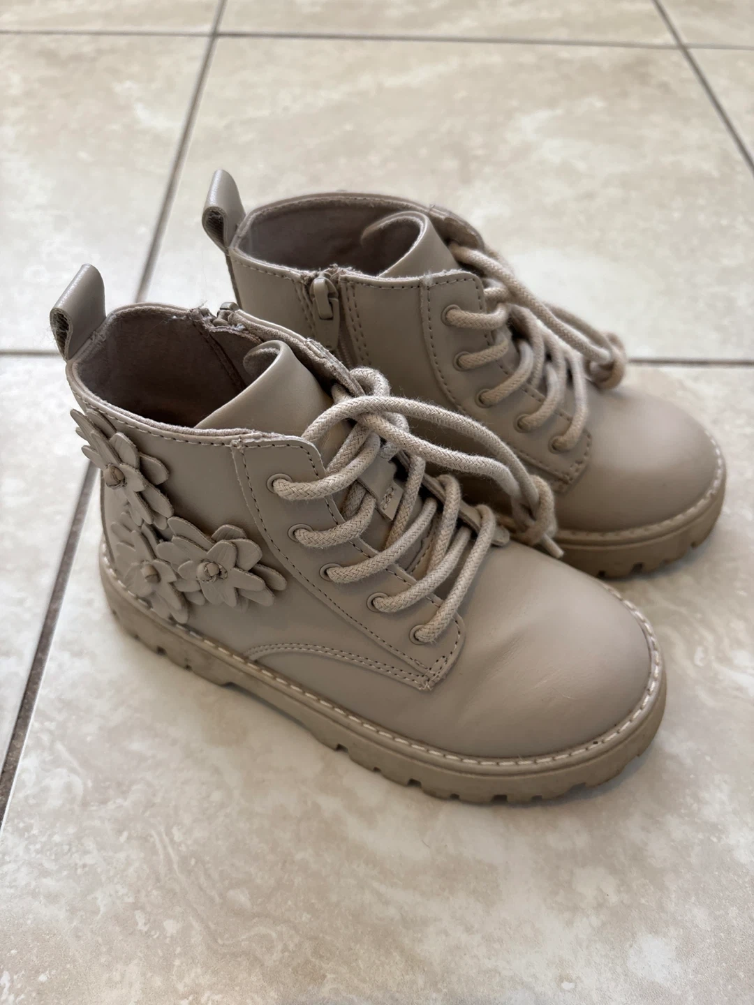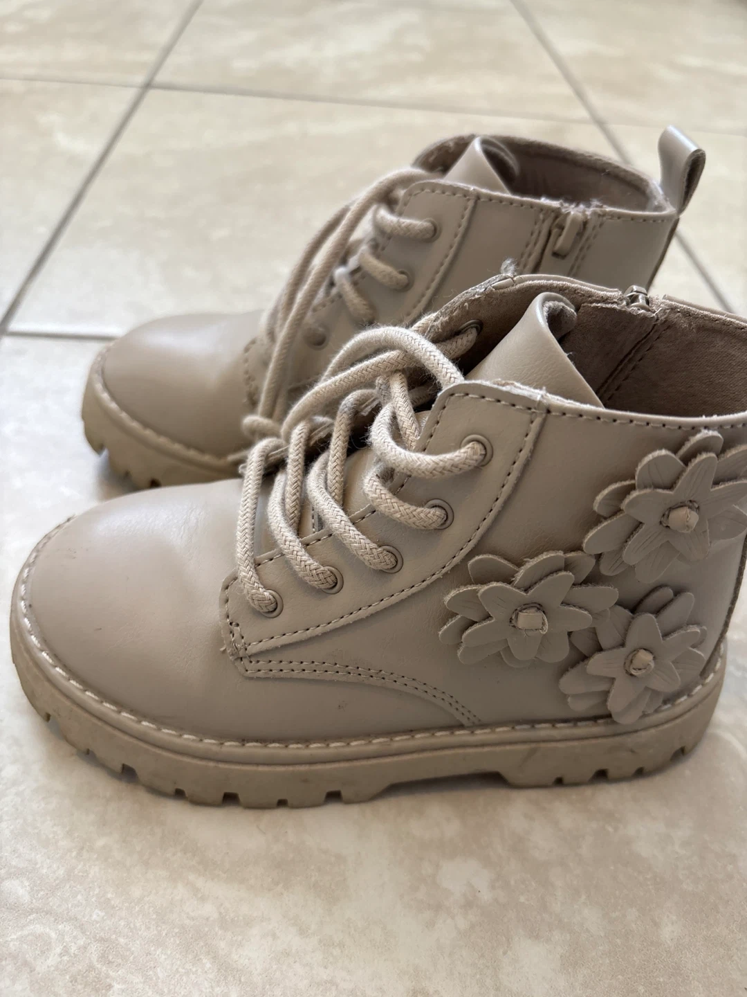 These adorable Zara girls' boots are in a lovely beige colour and feature a cute floral design on the side. They have laces and a zipper for easy on and off. Size 25.