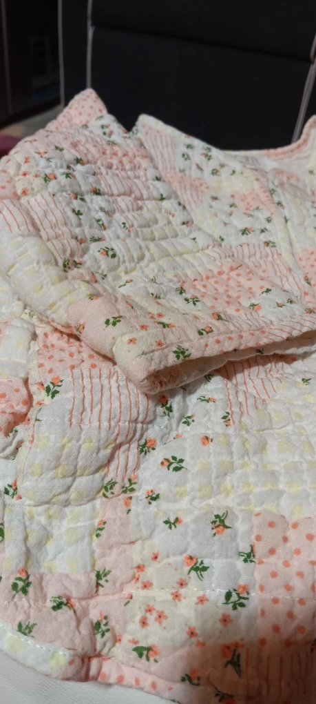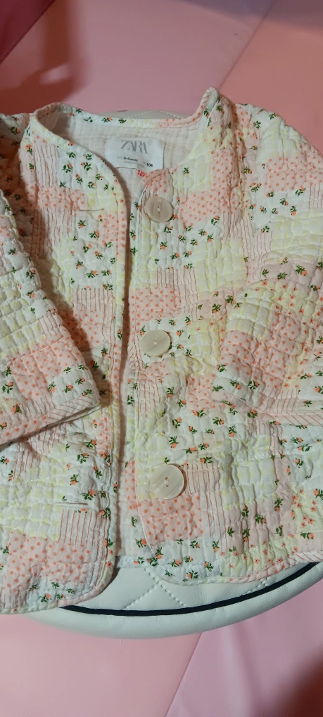 Adorable girls' quilted jacket. Peach and white floral pattern. Button closure. Size 3-4 years.