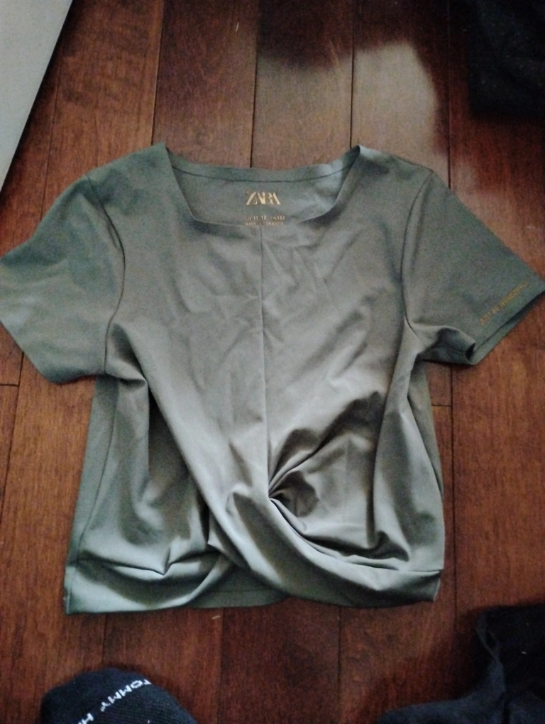 Green cropped top with short sleeves. Twist detail in the front. Size 11-12, made in Cambodia. Never worn