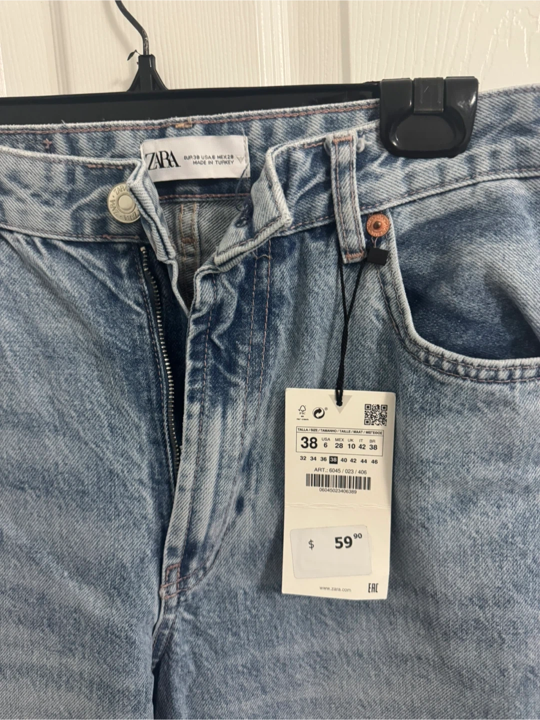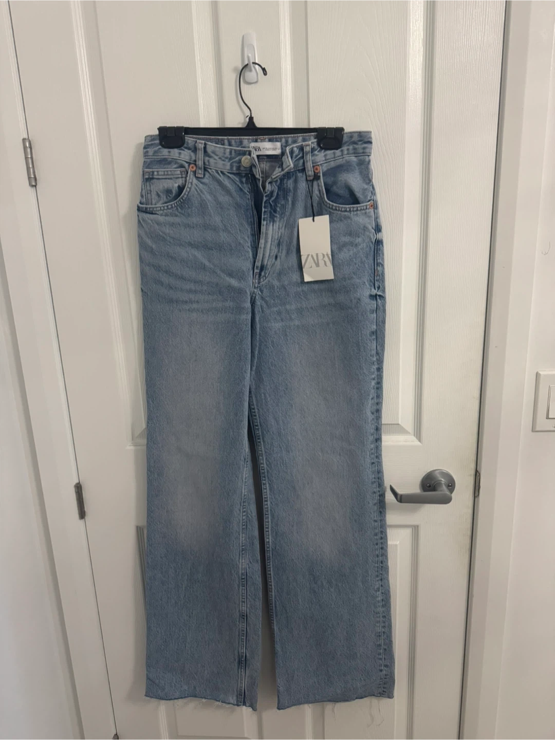 Selling a pair of Zara high-waisted jeans in size 38. They were never worn and have a tag attached.