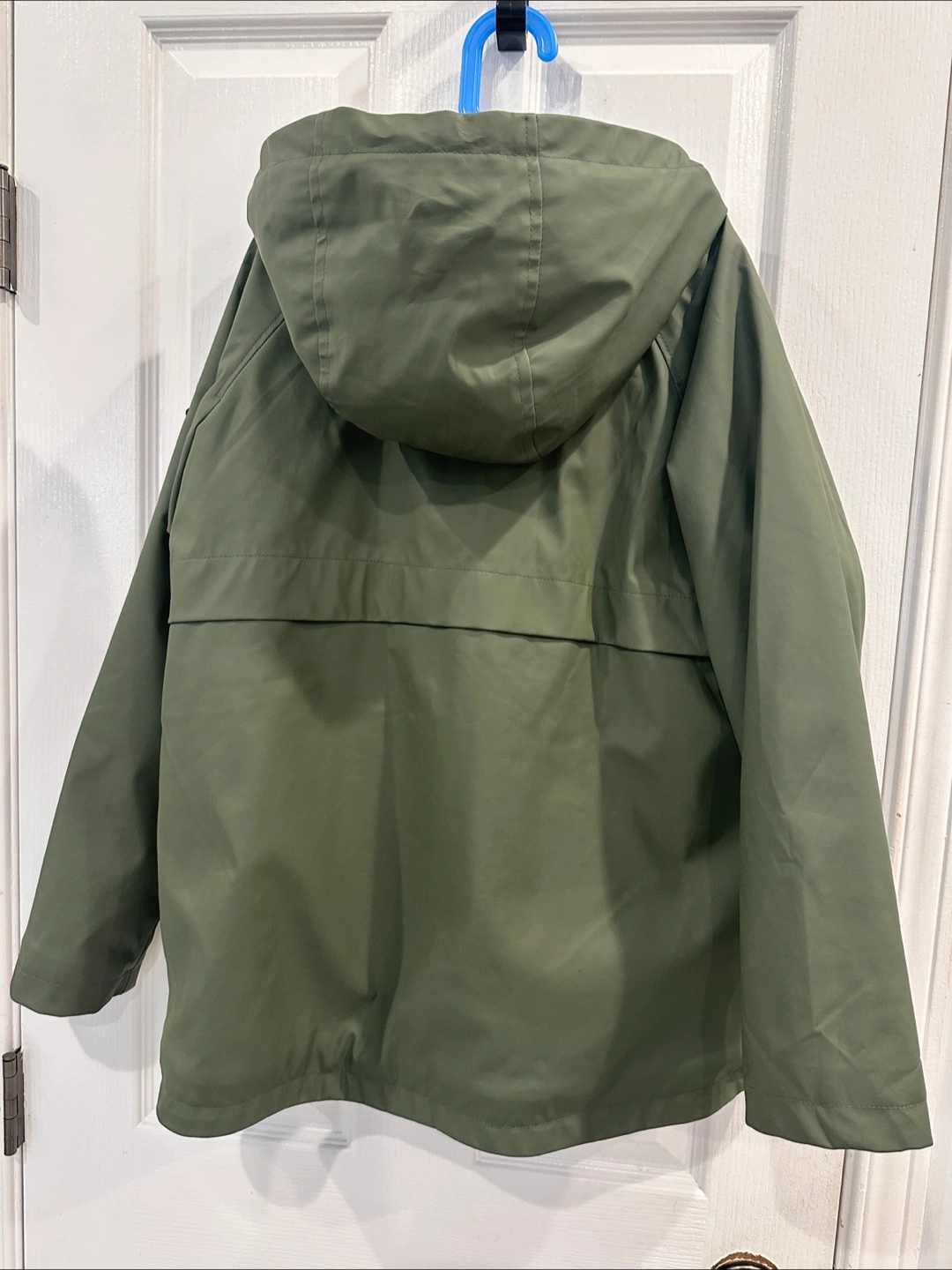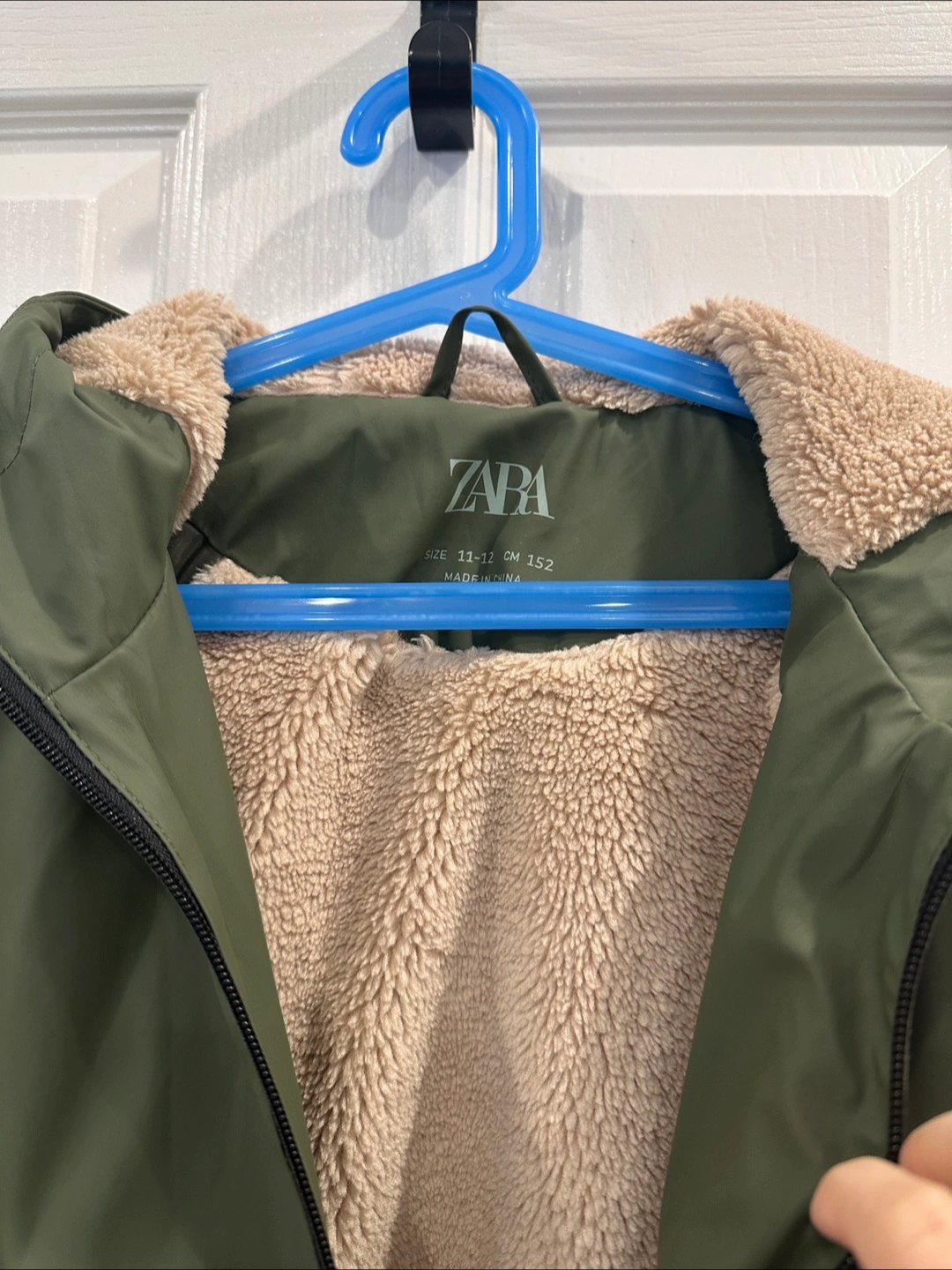 Olive green hooded jacket. Fleece lining. Zip closure. Two pockets. Size 11-12 (152 cm). Made in China.