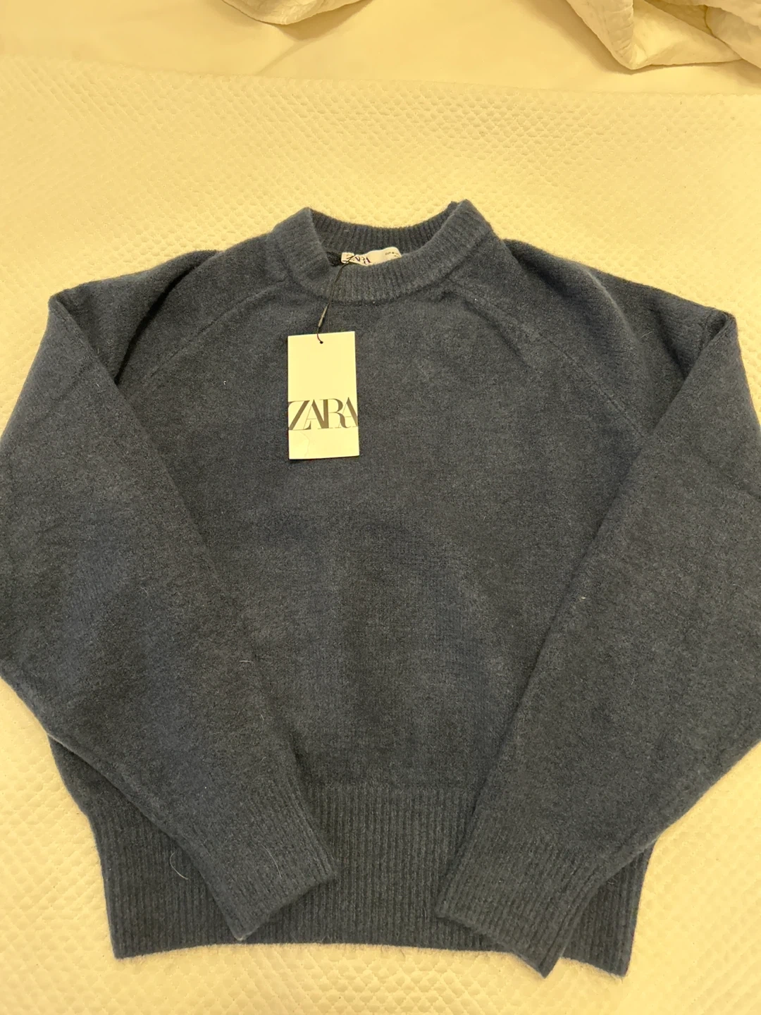 Cozy Zara knit sweater, size M. The material is 52% acrylic, 39% polyester, 6% elastane, and 3% wool. It's a nice, warm sweater for the cooler weather! Perfect navy colour.
