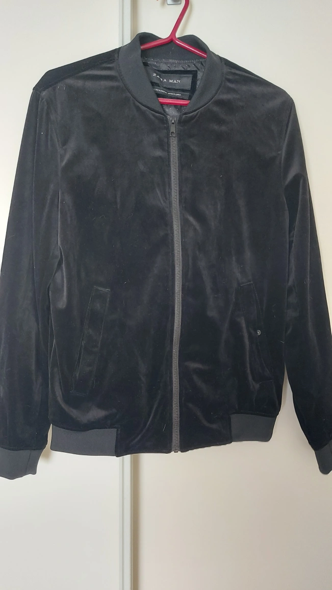 Men's black velvet bomber jacket. Zip closure. Ribbed cuffs and hem. Side pockets. Size M, but fit like S