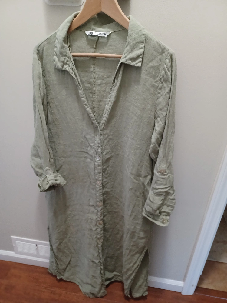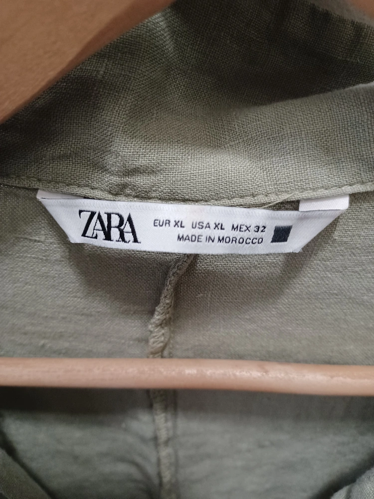 This is a Zara dress in size XL. It's a beautiful olive green colour and made of linen. Perfect for a casual day out or dressed up for an evening! It is in great condition, just needs to be ironed. Picture doesn't do justice.