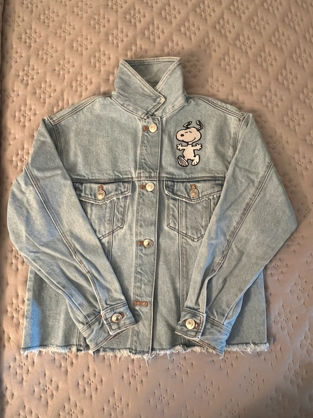 Selling a Zara Peanuts denim jacket in size 10! It's in great condition and features super cute Snoopy and Charlie Brown designs. Perfect for any Peanuts fan!