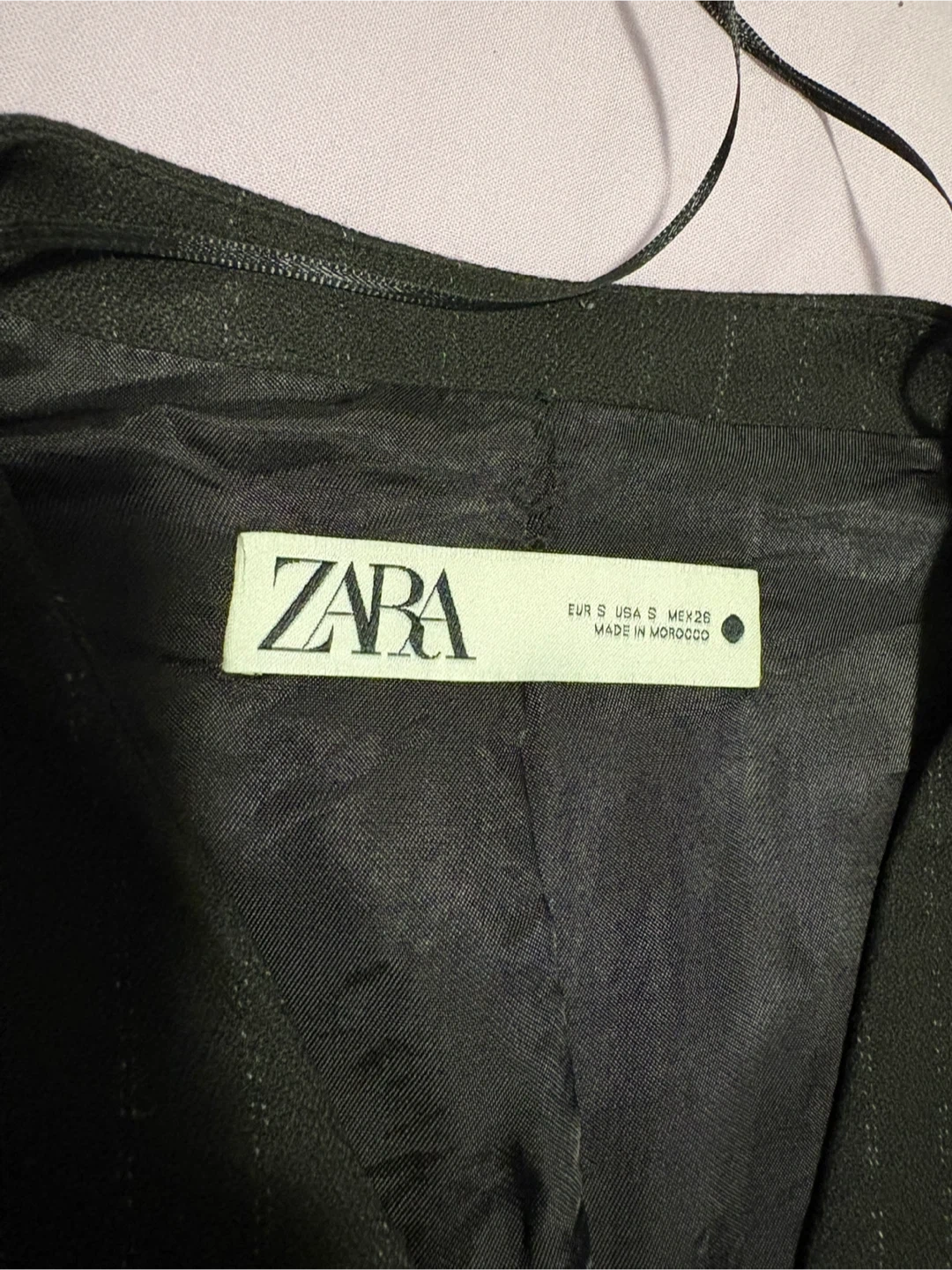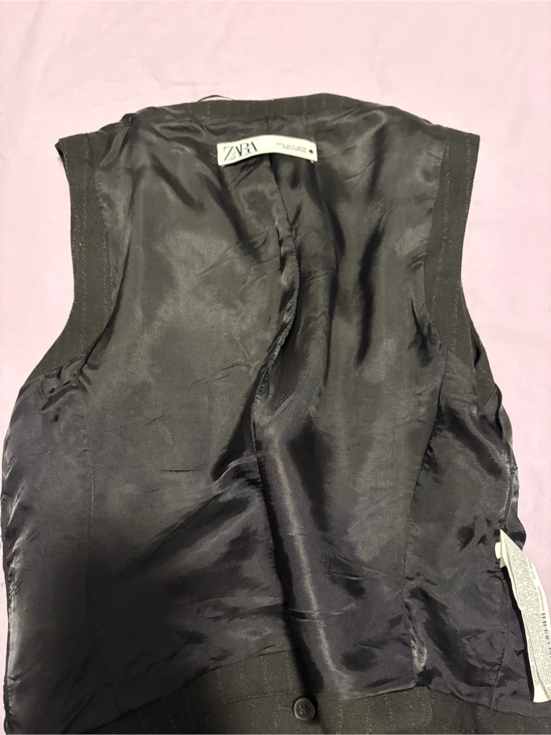 a black Zara pinstripe vest in size small. It's a stylish addition to any wardrobe! The vest features a classic pinstripe pattern and is in great condition.