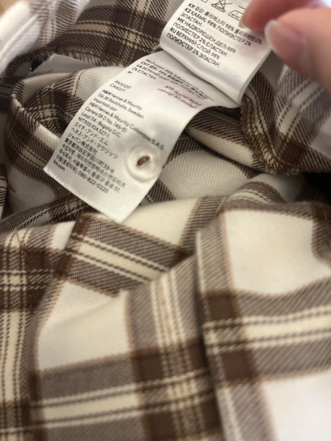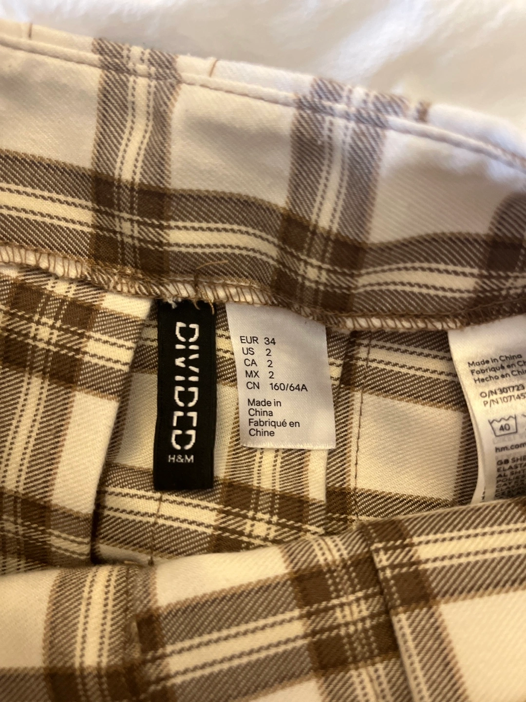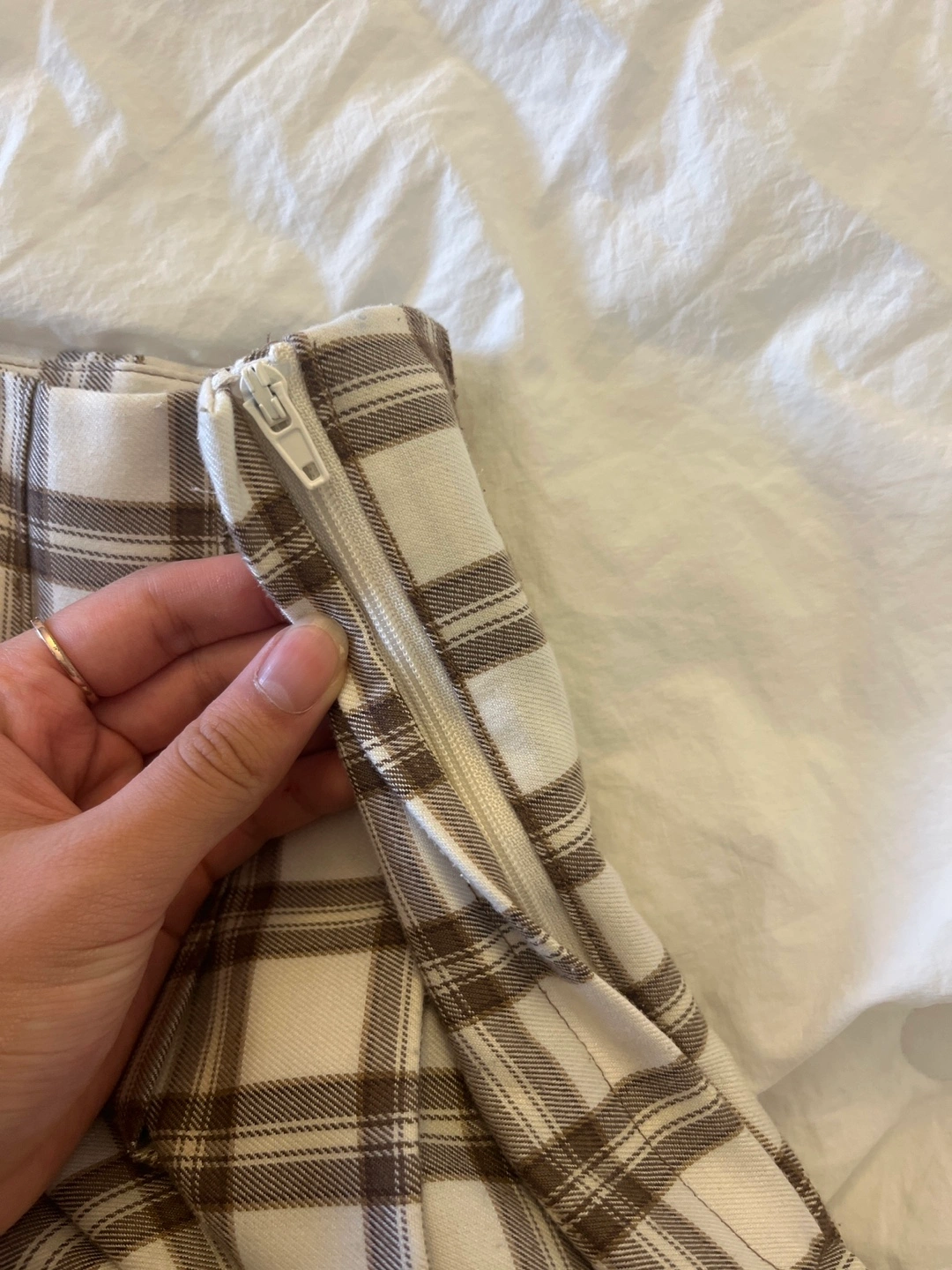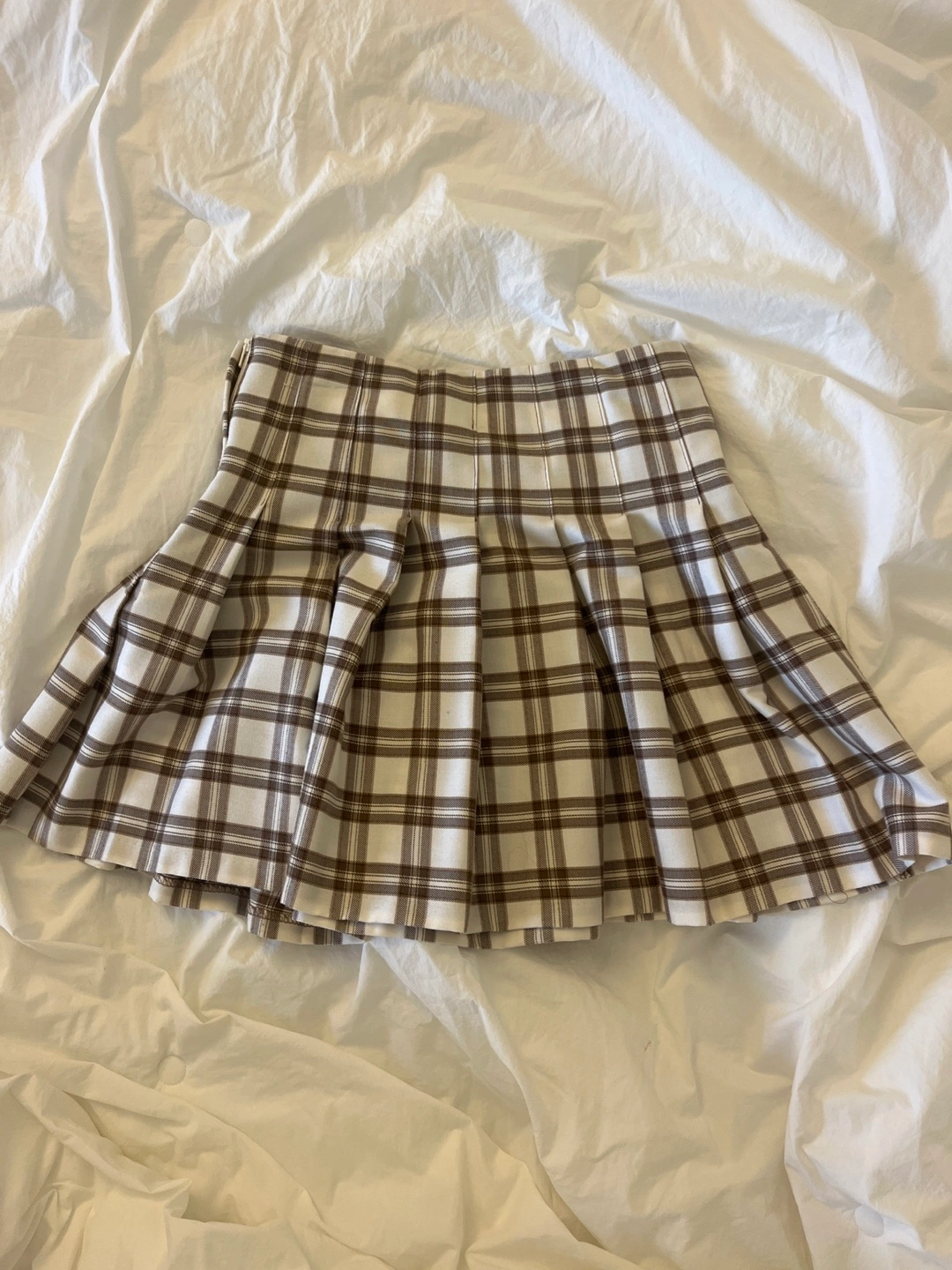 Tennis skirt with beige and brown plaid pattern Zipper on side, extra button still on tag