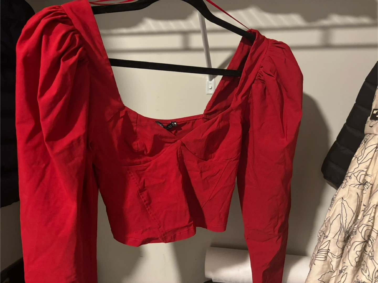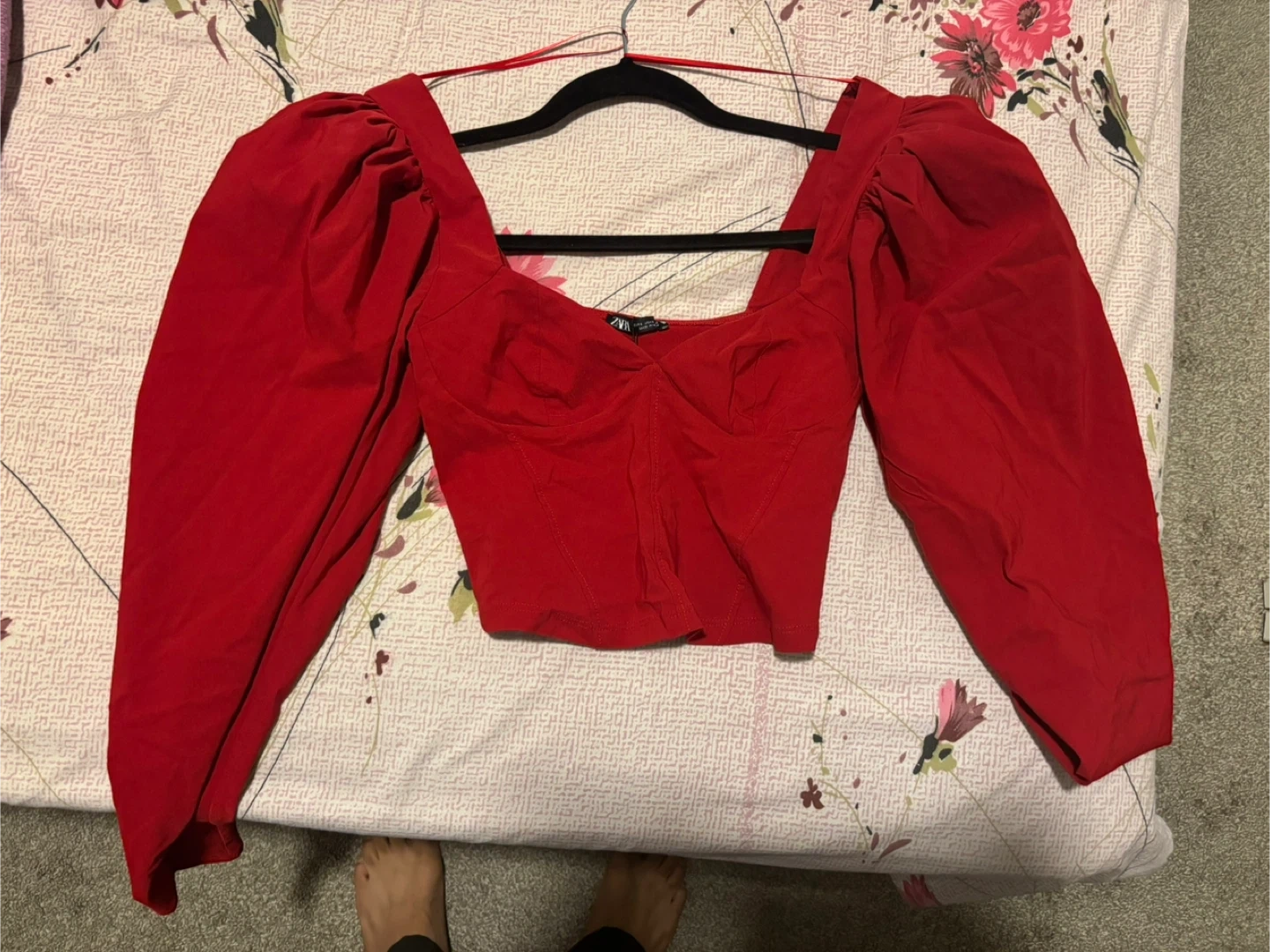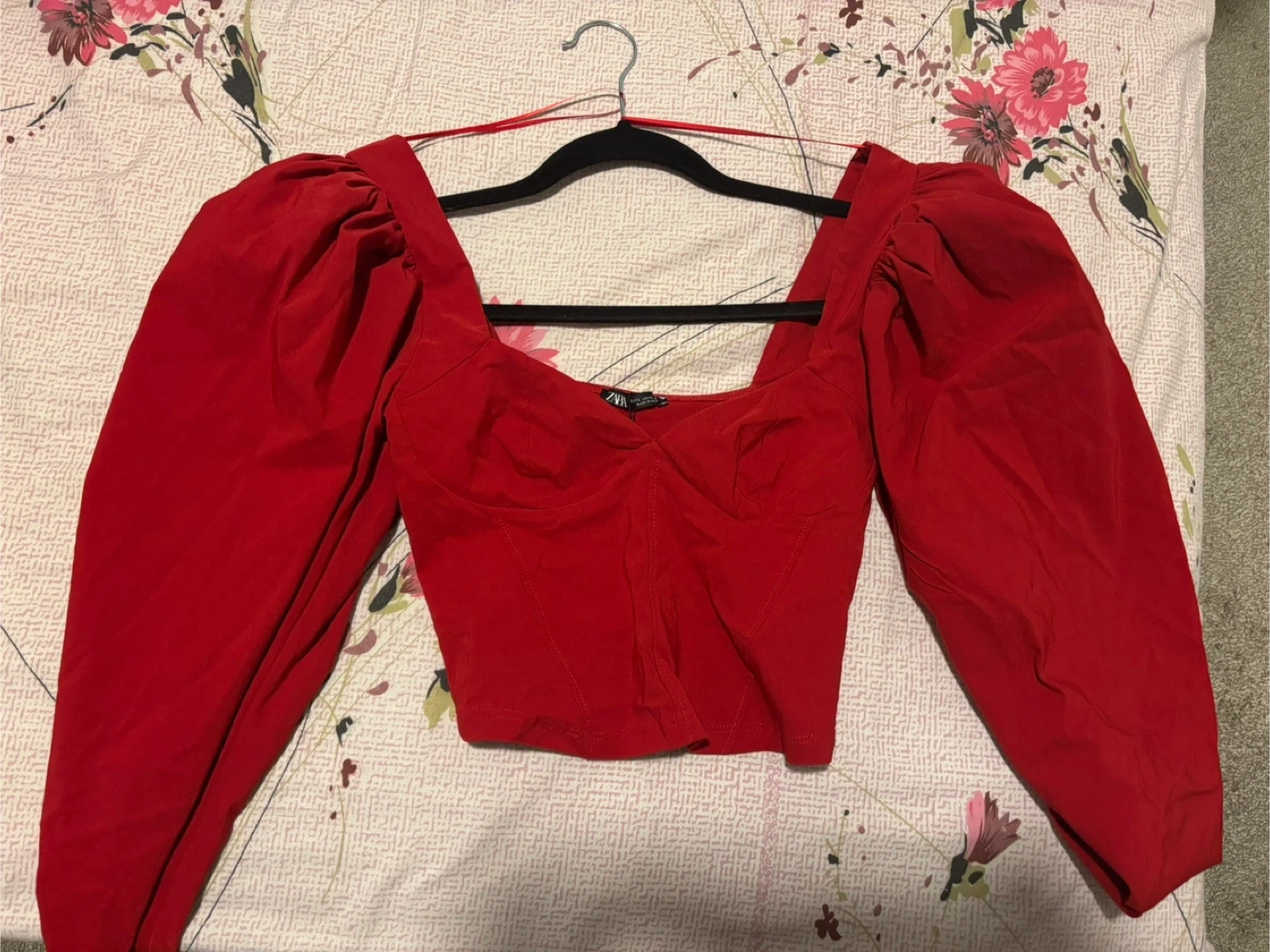 Selling a Zara red puff sleeve corset top in size small! It's in great condition and ready for a new home. The material is comfortable and the puff sleeves add a fun touch! It is brand new and never worn