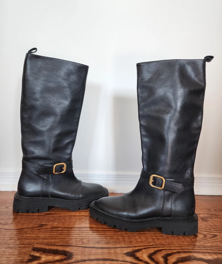 Selling a pair of Zara knee-high boots in black faux leather. Retails for $70 Selling for $30 Size 8 Stylish gold buckle detail Condition as good as New