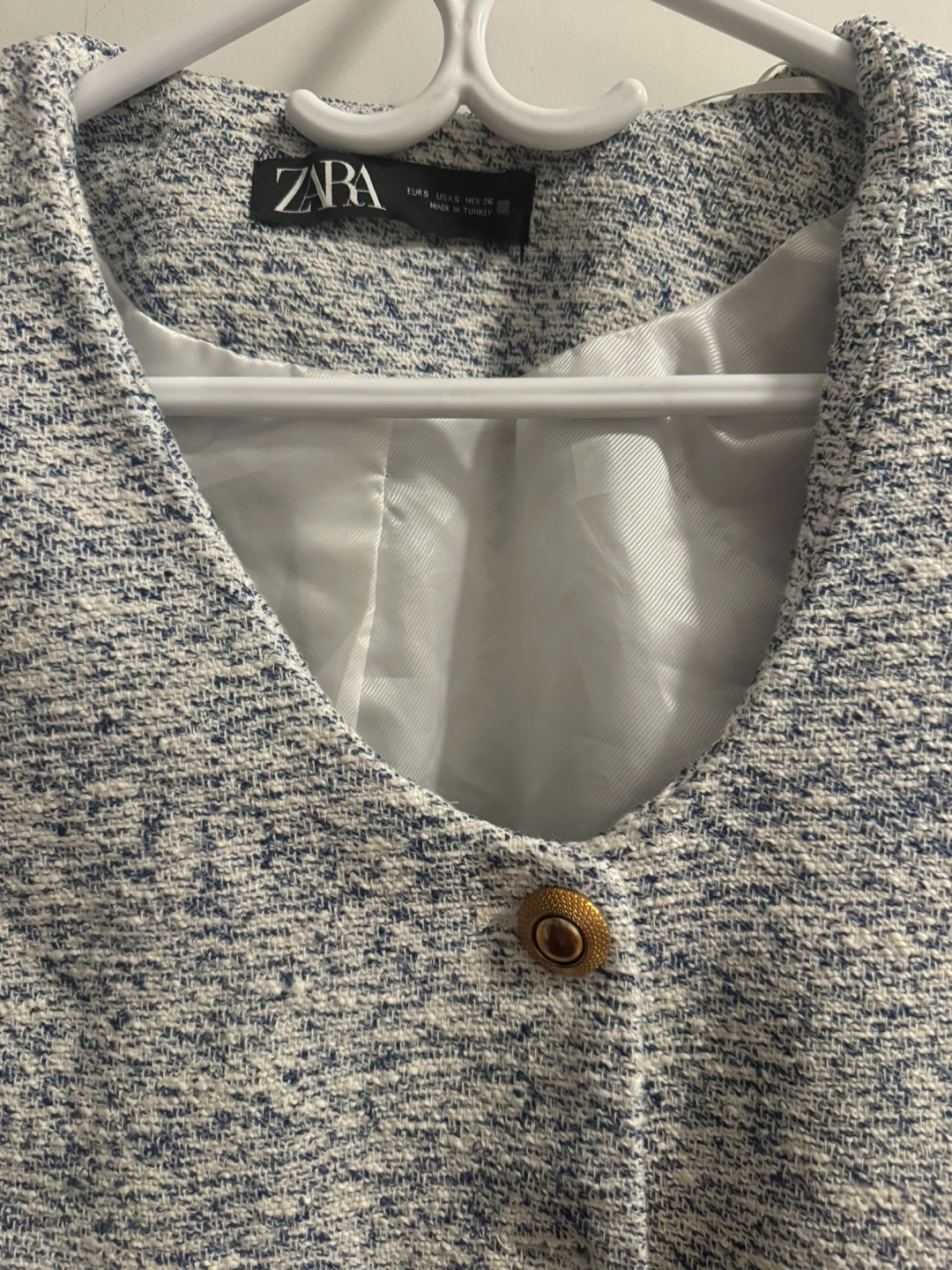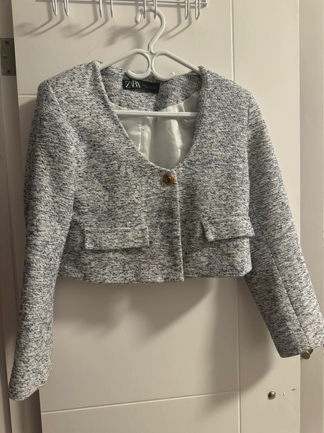 Selling a cute Zara tweed cropped jacket in size small! It's in great condition and would be a lovely addition to any wardrobe. The material is soft and comfortable, perfect for layering on cooler days. It features a single button closure and two small pockets.