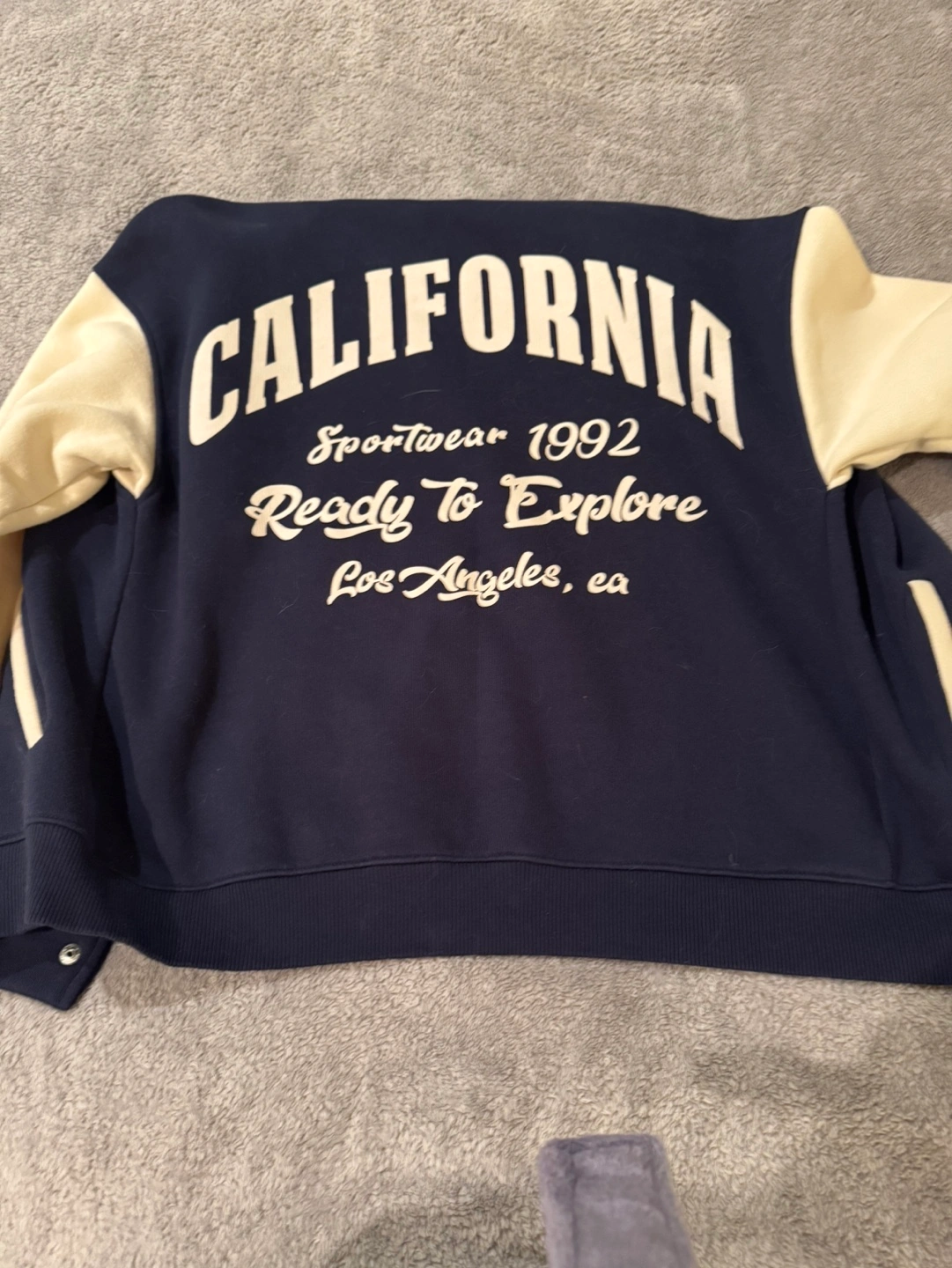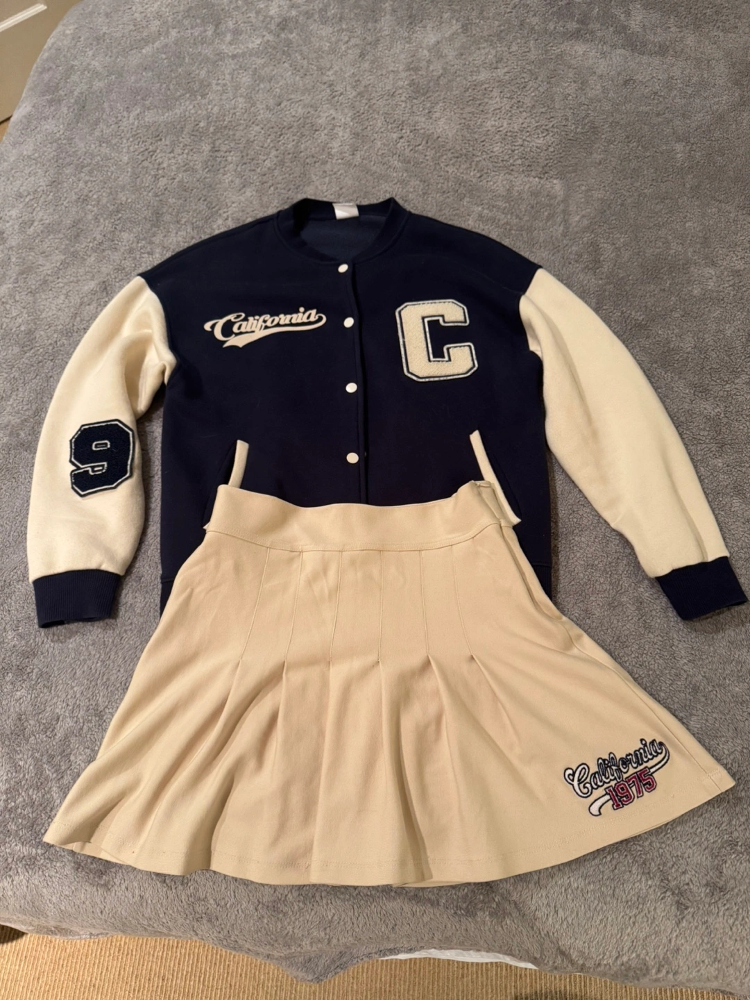 Blue and cream varsity jacket with matching cream skirt. Embroidered with "California 1992" on the back of the jacket. Size 13-14 old (teen size)