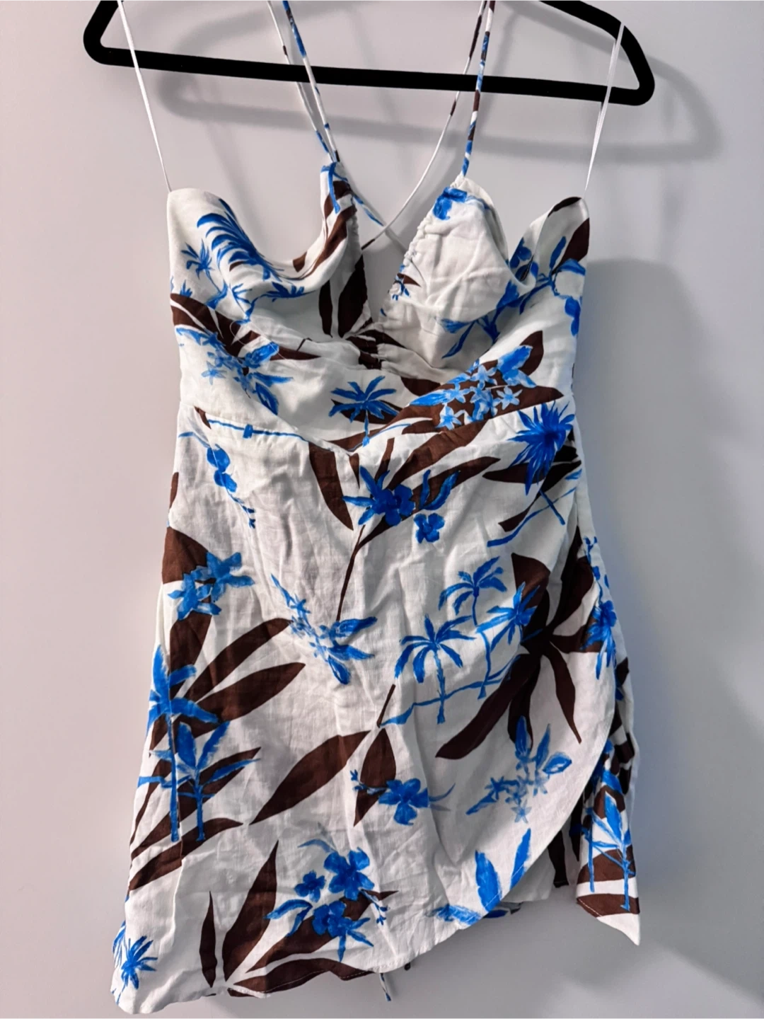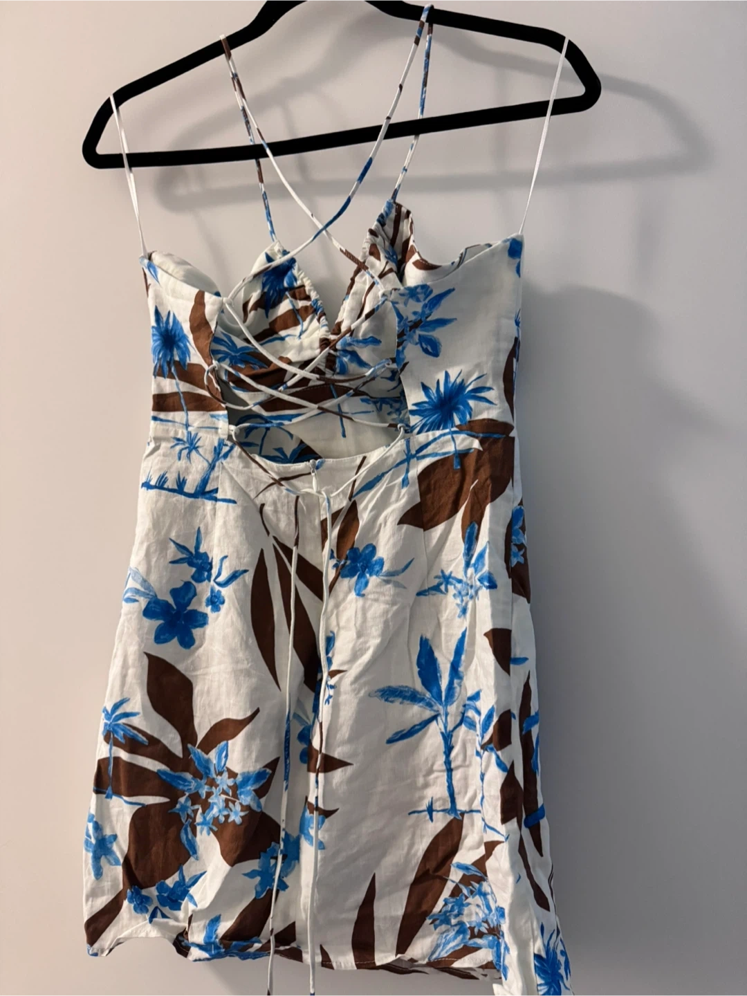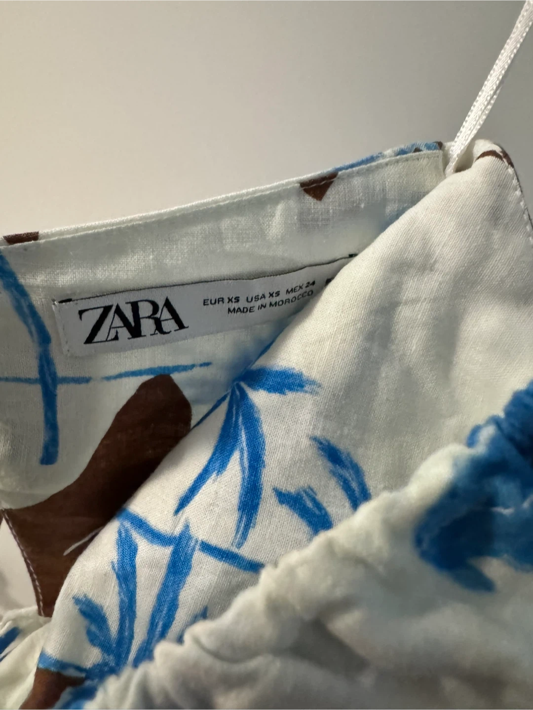 Cute Zara mini dress with a fun floral pattern! It's white with blue and brown floral designs. Size XS, perfect for summer days!