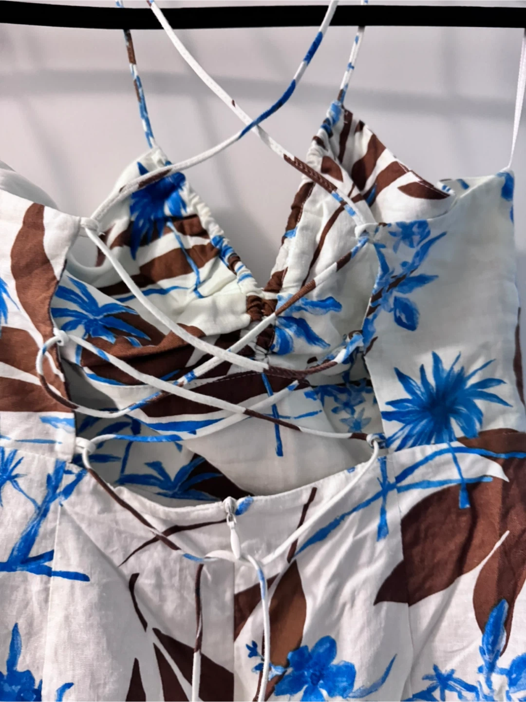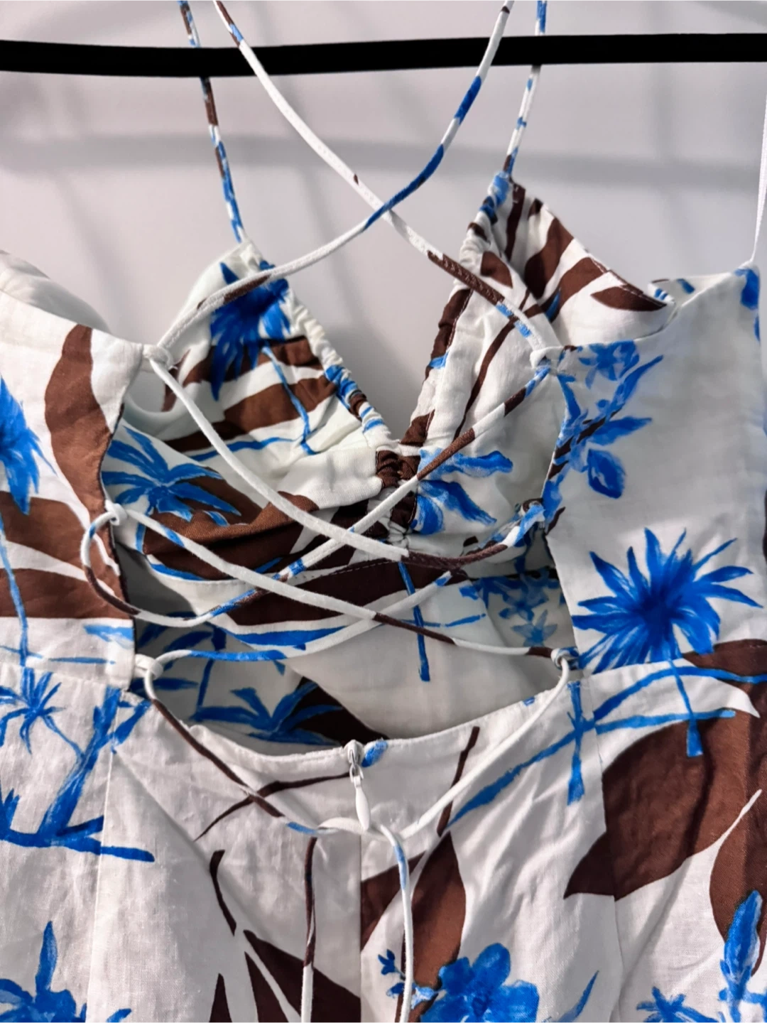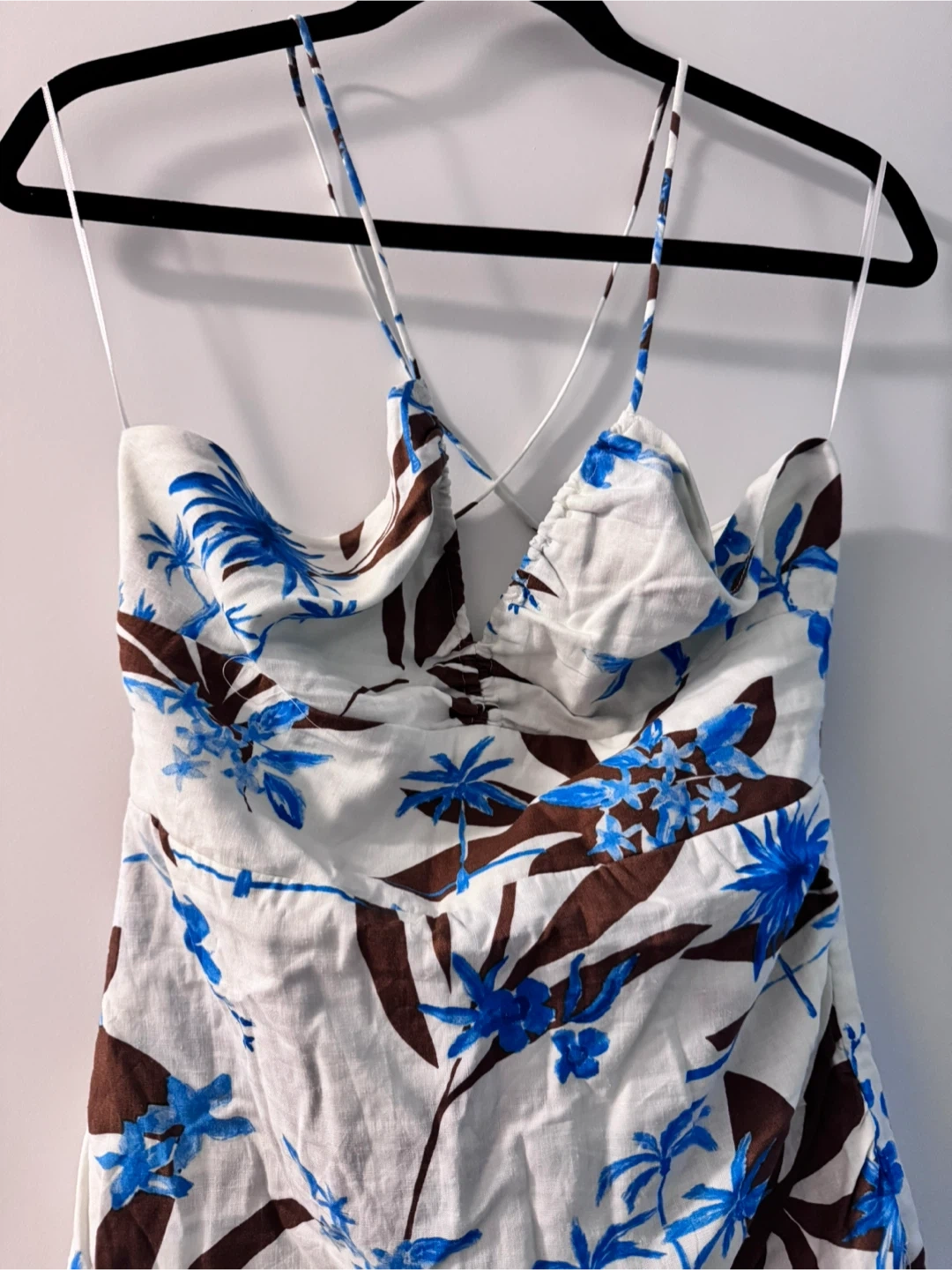 Cute Zara mini dress with a fun floral pattern! It's white with blue and brown floral designs. Size XS, perfect for summer days!