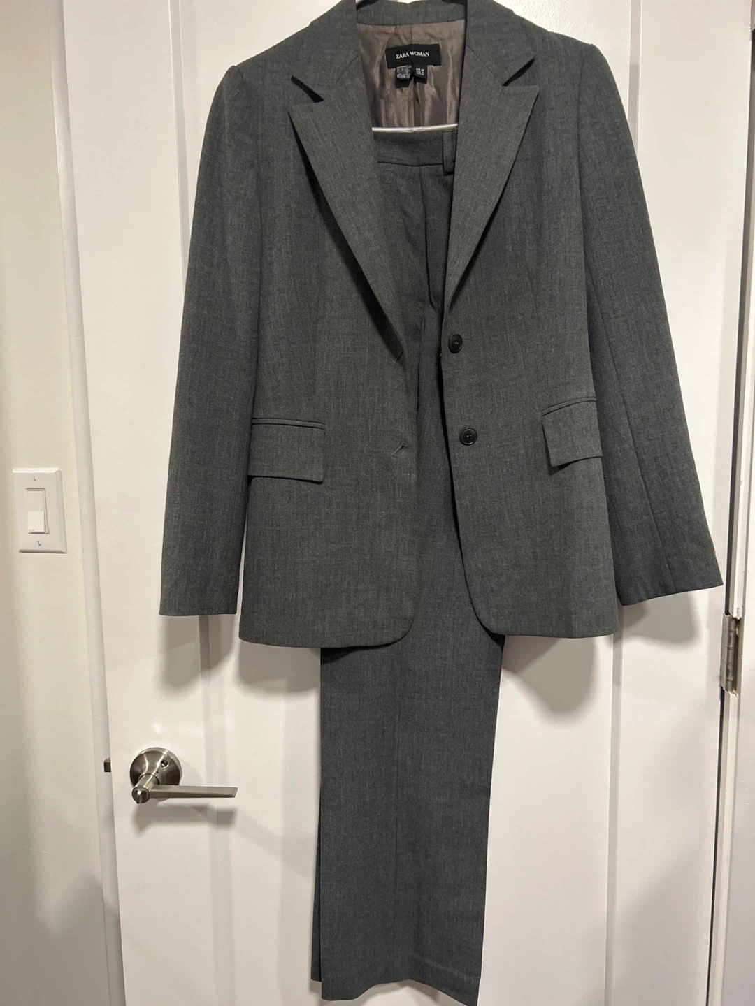 Selling a Zara Woman suit set in grey. It includes both the blazer and the pants. Perfect for work or a special occasion!
