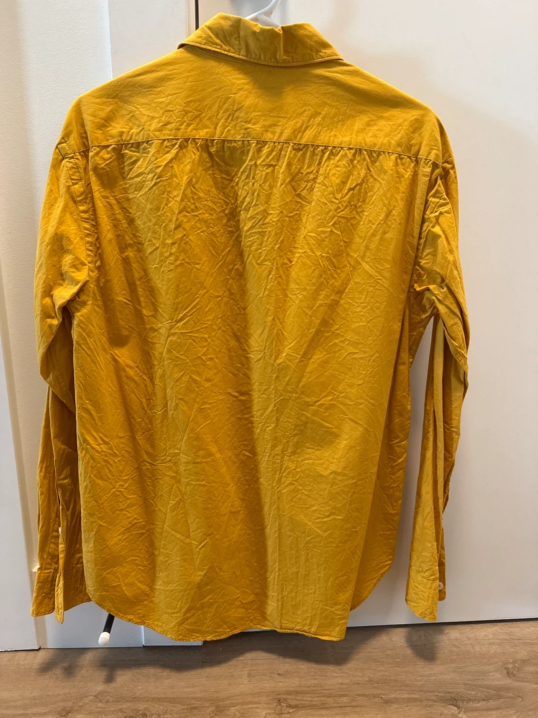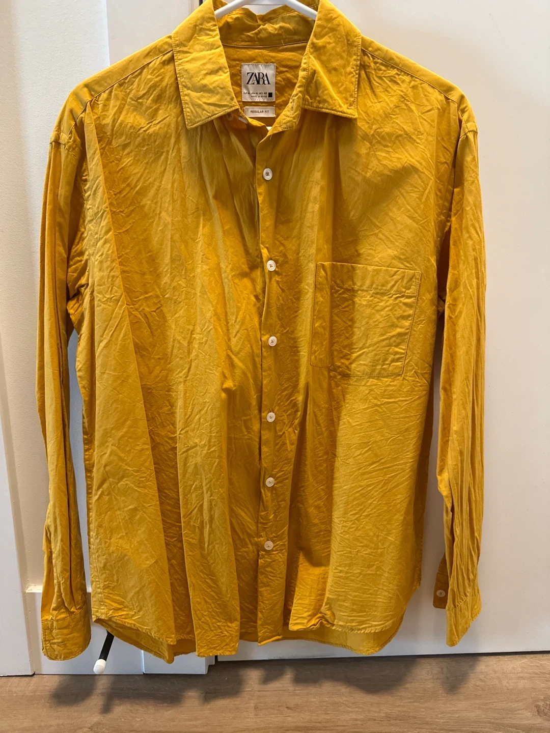 Selling a Zara yellow button-up shirt in regular fit. The material has a unique texture and the colour is a vibrant yellow. It's a stylish and comfortable shirt for casual wear