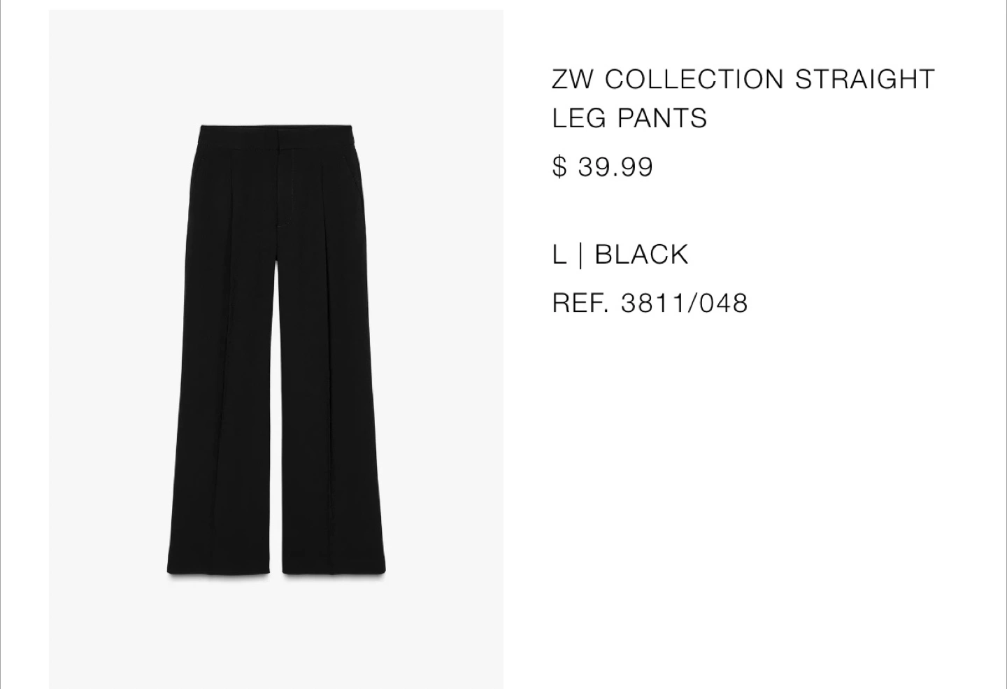 Selling a pair of Zara ZW Collection straight leg pants in black. Size L Brand new without tag. Bought recently, but changed my mind, no longer needed. Can’t return since no tags. Never worn. Also have these in white.