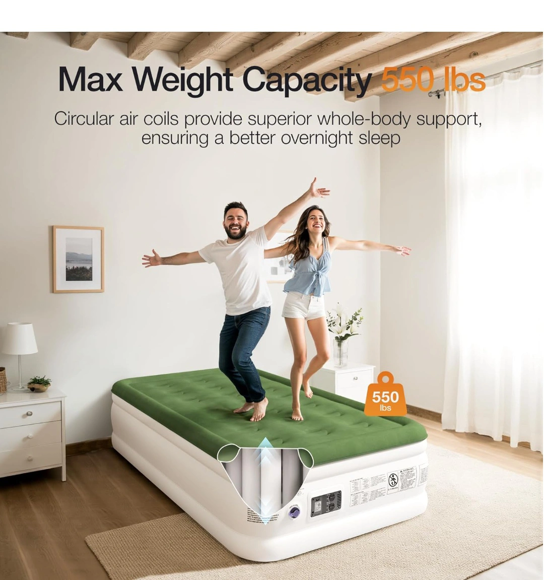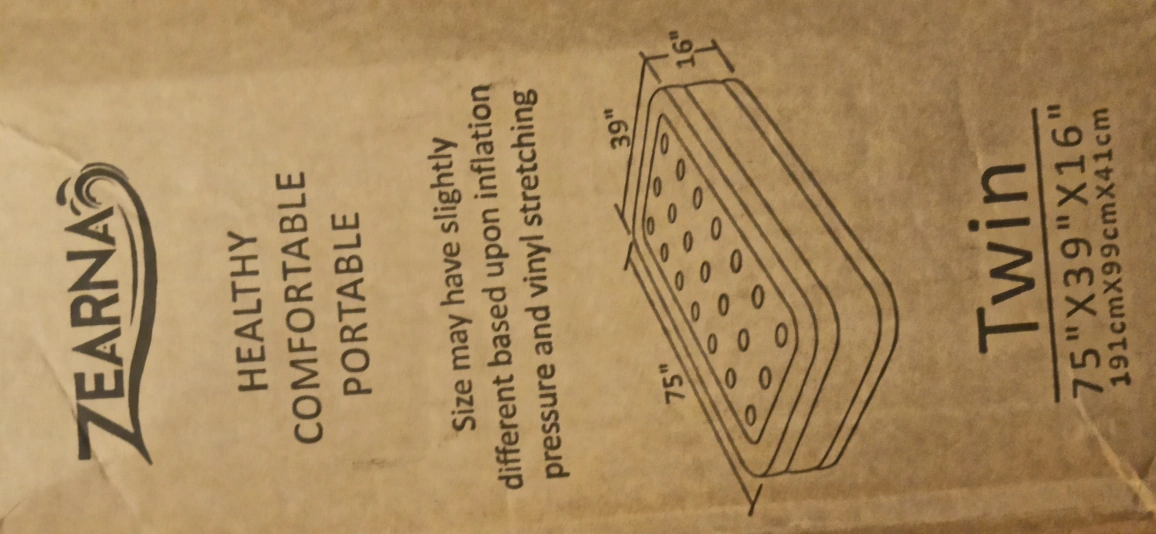 Selling a brand new Zearna Twin Air Mattress! It comes with a built-in pump for quick and easy inflation in just 2 minutes. - Inflatable mattress, perfect for camping, home, or portable travel - Double air chamber - Max weight capacity: 550 lbs - Dimensions: 75" x 39" x 16".