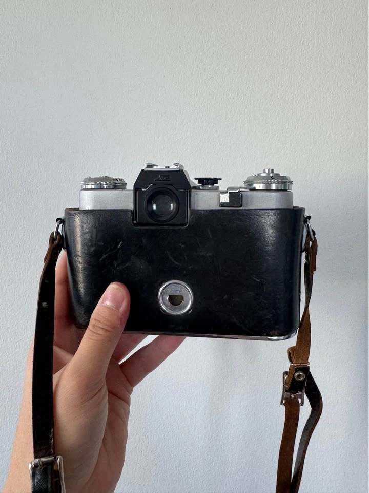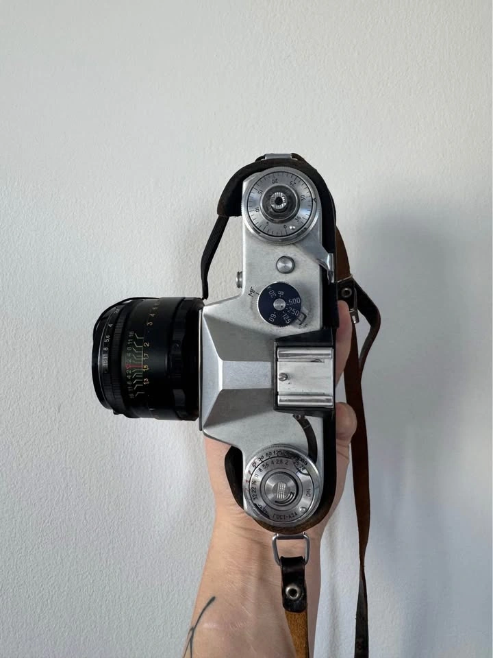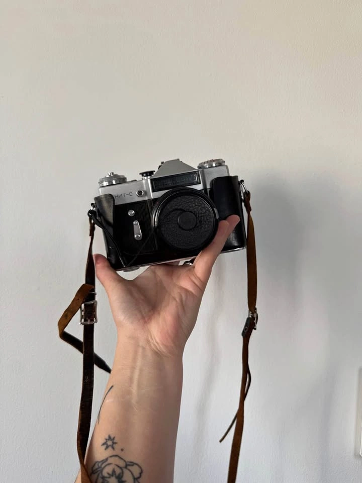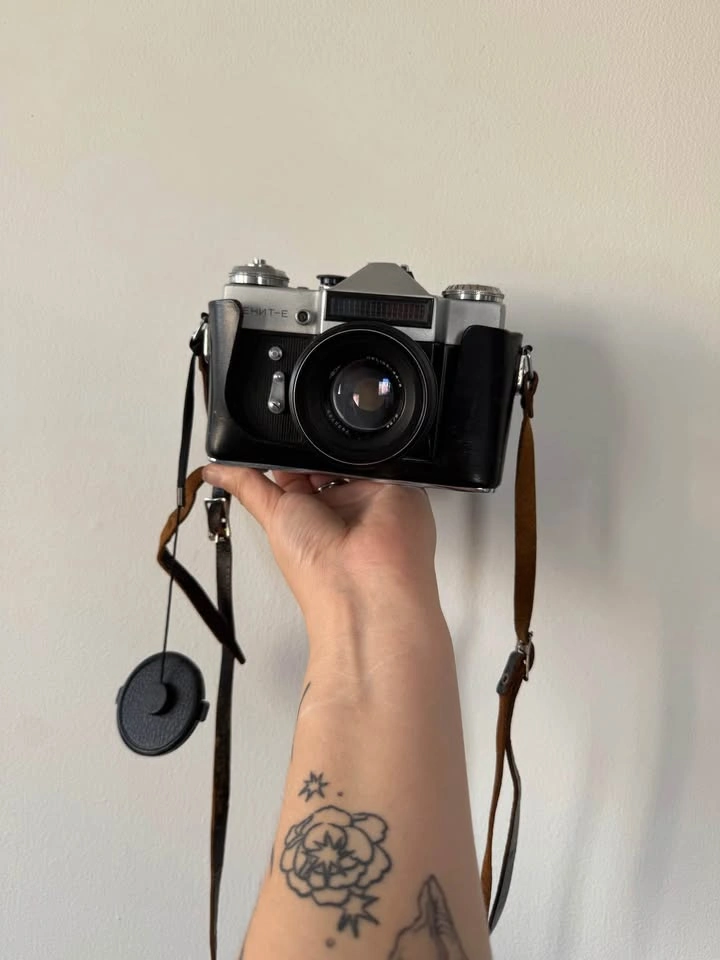 Zenit E film camera in protective case with manual controls. Unsure if it works as its only been used as a decoration.