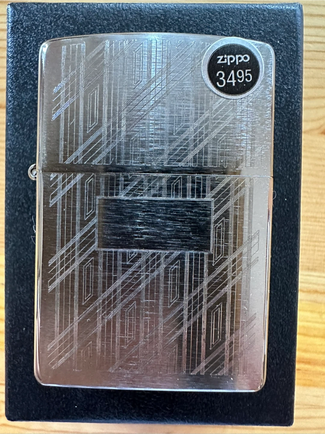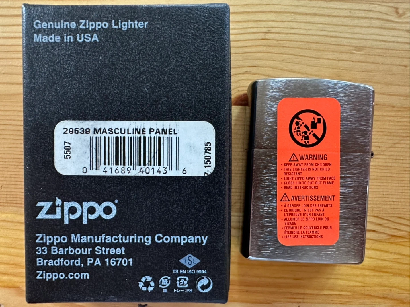 Selling a brand new Zippo lighter, still in its original box! This is the Masculine Panel design, made in the USA. The bottom of the lighter is marked with 'B 17', indicating it was manufactured in February 2017. A great piece for collectors or everyday use!