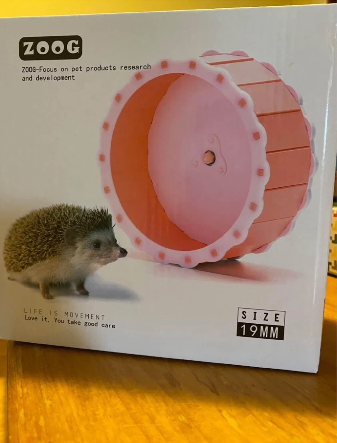 I have a ZOOG pet exercise wheel for sale! It's pink and perfect for small hamsters. The size is 19mm, ensuring a comfortable fit for your little friend. It promotes movement and good care for your pet