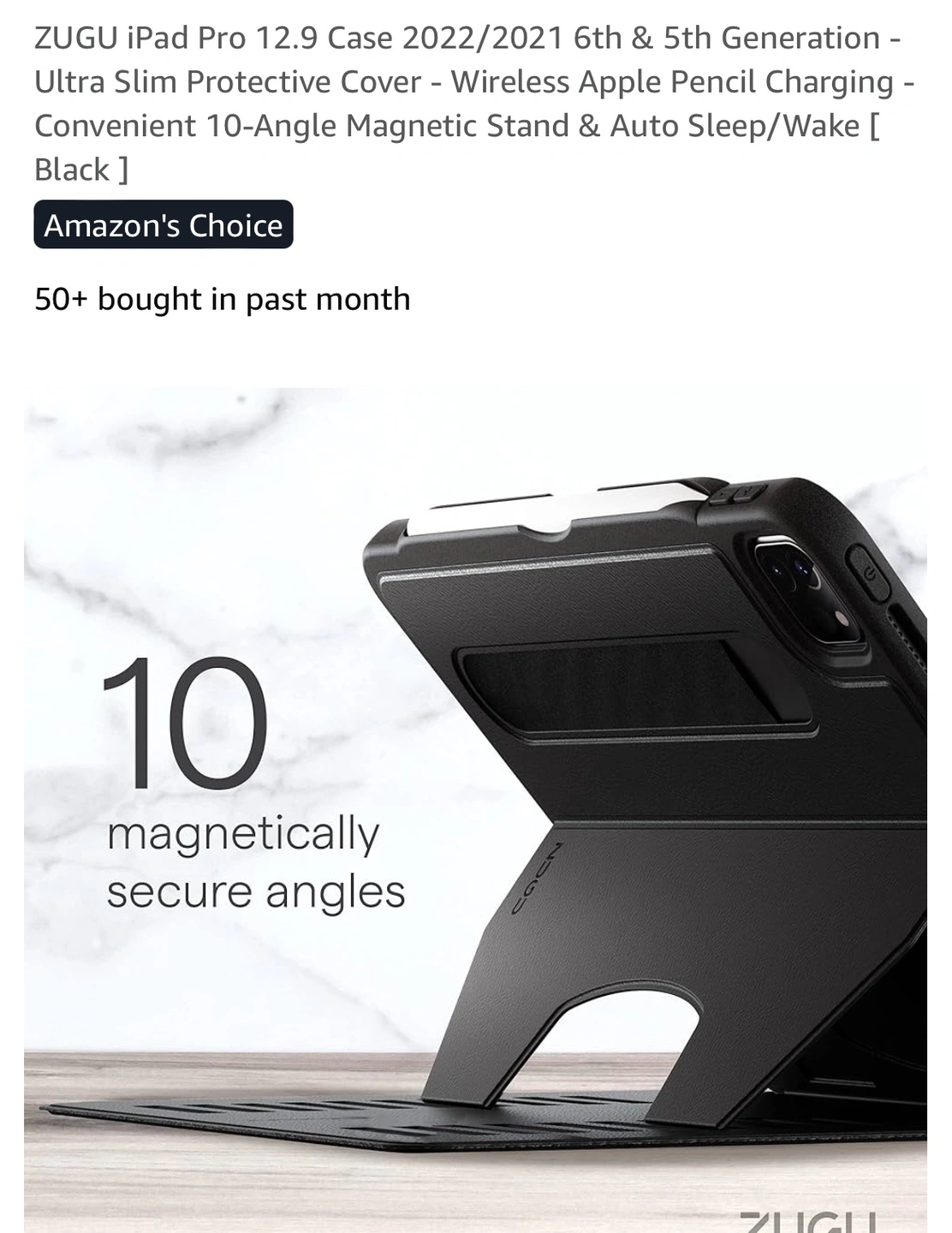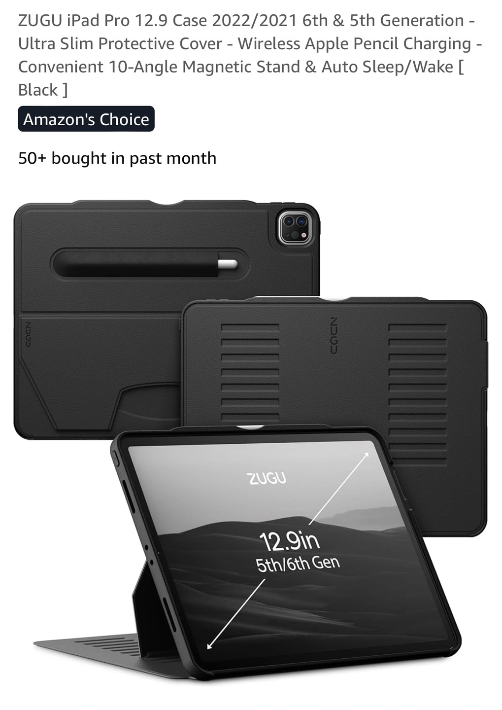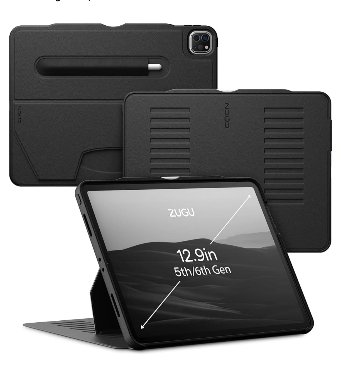 Black iPad Pro 12.9 case with built-in pencil holder and magnetic stand. This case is compatible with the 5th and 6th generation iPad Pro. The case offers multiple viewing angles.